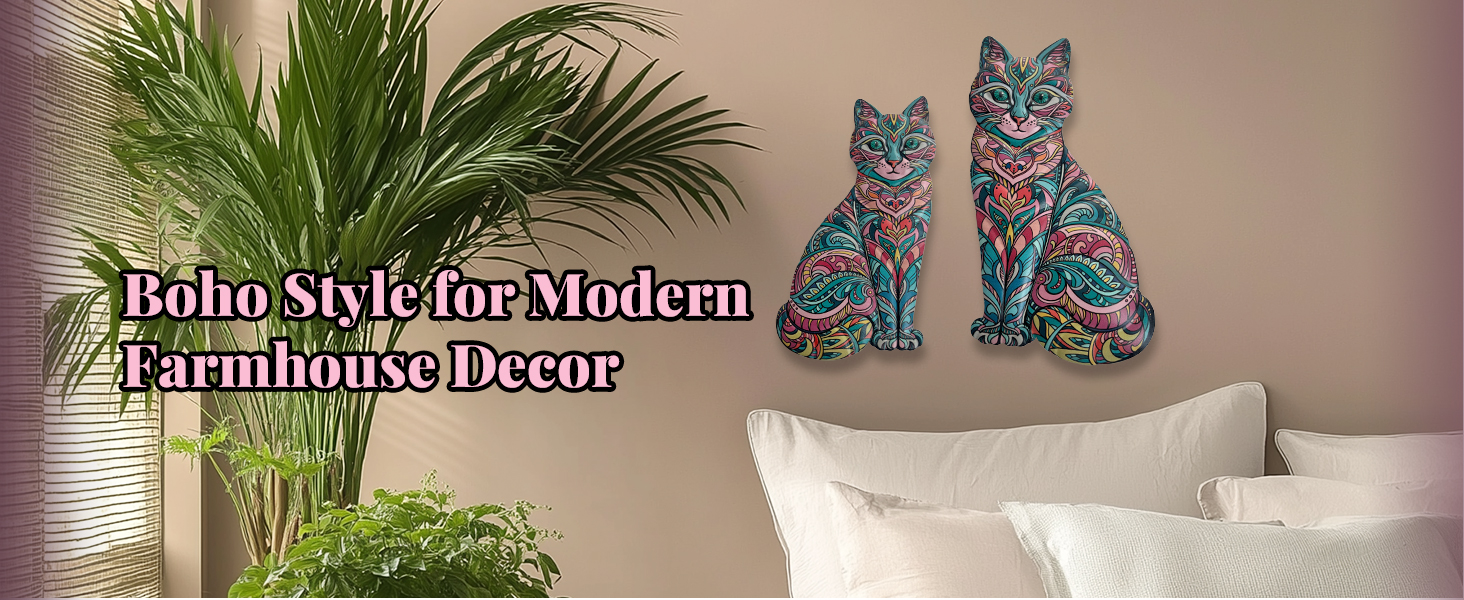 Enchant Your Space with Bohemian Flair: Boho colorful cat wall art set of 2, transform your walls into a whimsical sanctuary with this charming metal plaques, designed to captivate cat lovers and boho enthusiasts alike. It bring your walls to life with vitality and charm