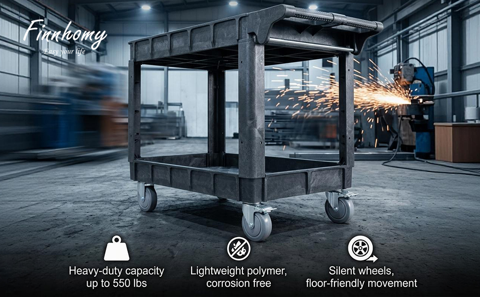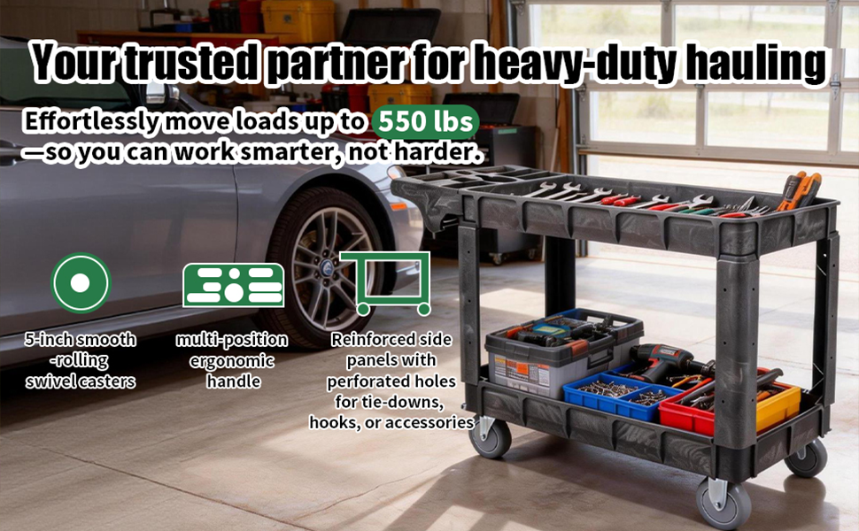 STURDY & DURABLR: This utility carts are consistently built with industrial-strength polypropylene. Commercial grade PP promise this rolling cart won't get rusted, chipped or dented, whole cart can load up to 550 LBS and ensure long life use in industrial and professional settings.