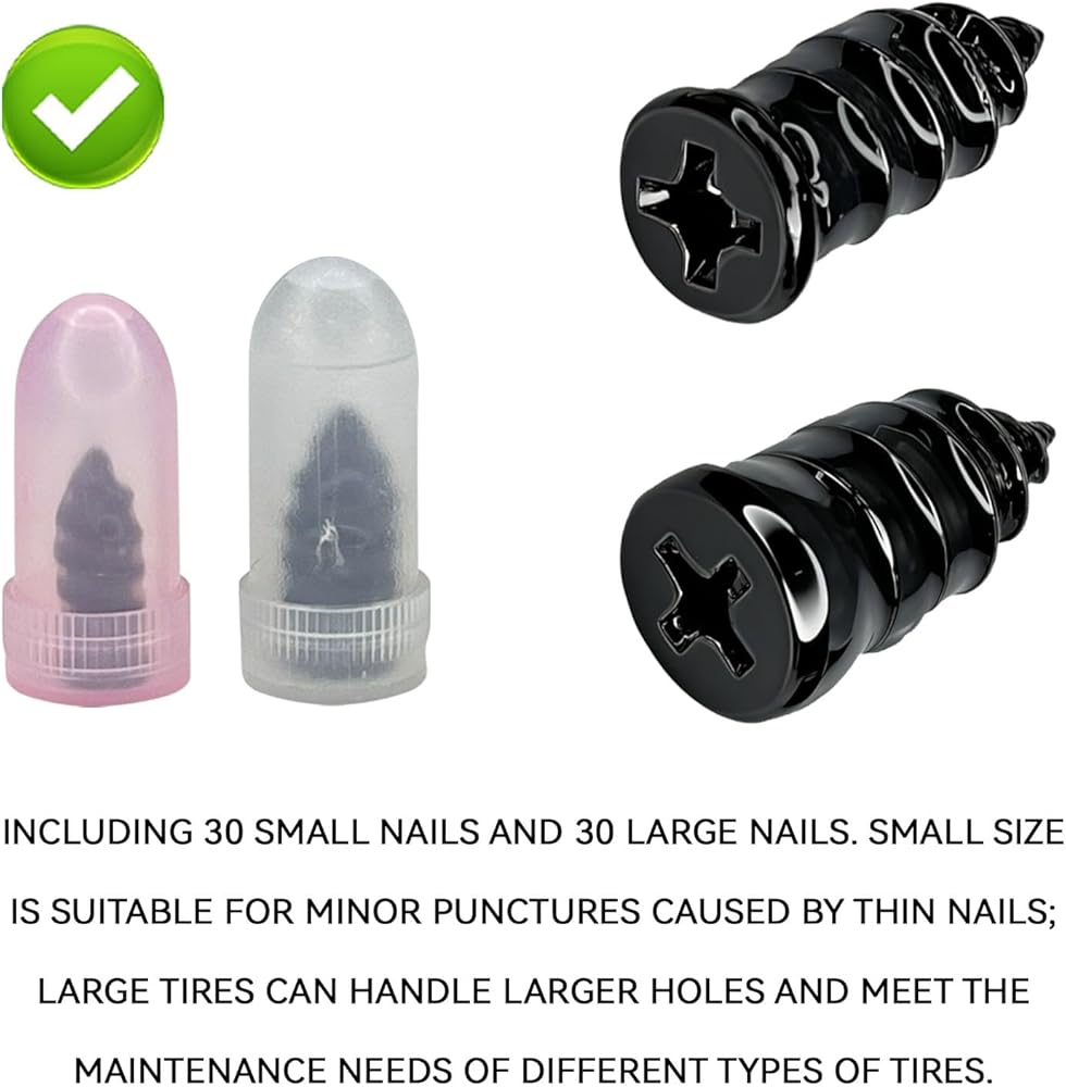 【Individual Packaging】 You will receive 60 tire repair rubber studs (30 small 0.21x0.47 inch studs and 30 large 0.26x0.59 inch studs, for different puncture sizes) and 1 screwdriver. Each tire plug screw is individually packaged in a protective capsule to effectively prevent the intrusion of dust, moisture, and dirt, ensuring it is clean and like new every time you use it. The quantity is sufficient to meet your daily needs
