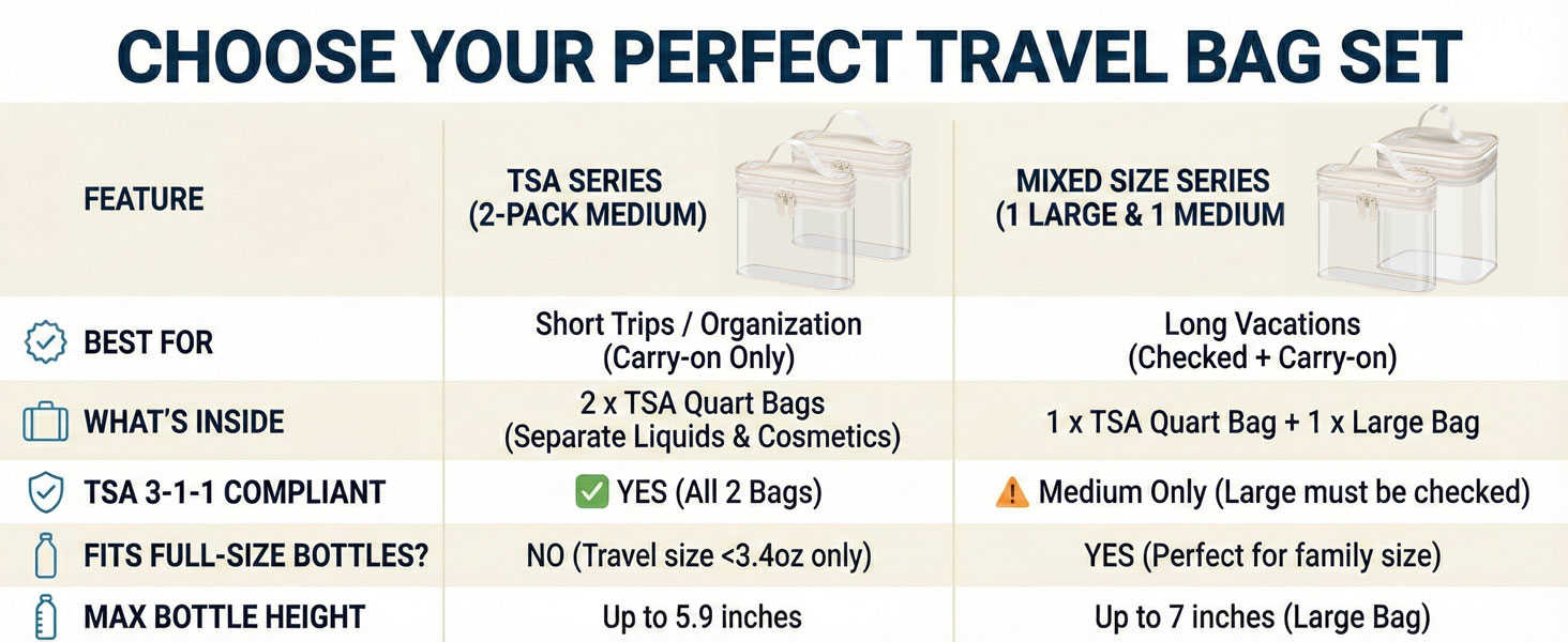 TSA 3-1-1 Limit Reached: 2-Pack / Same Medium Size (7.5 x 2.4 x 5.9 inches). We maximized every inch of space strictly within TSA carry-on regulations. It perfectly holds ~four 3.4oz travel bottles plus small essentials. [NOTE: Compact TSA size, NOT for full-size shampoo]