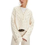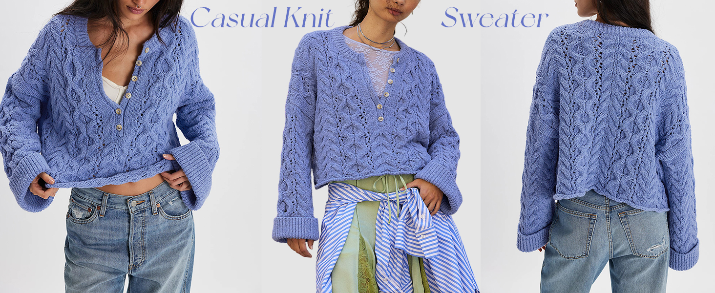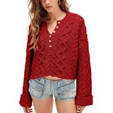 This oversized, slouchy pullover features dropped shoulders, long bell sleeves, and an adjustable button neckline, with a solid color design and crochet mesh details for a cute yet stylish look