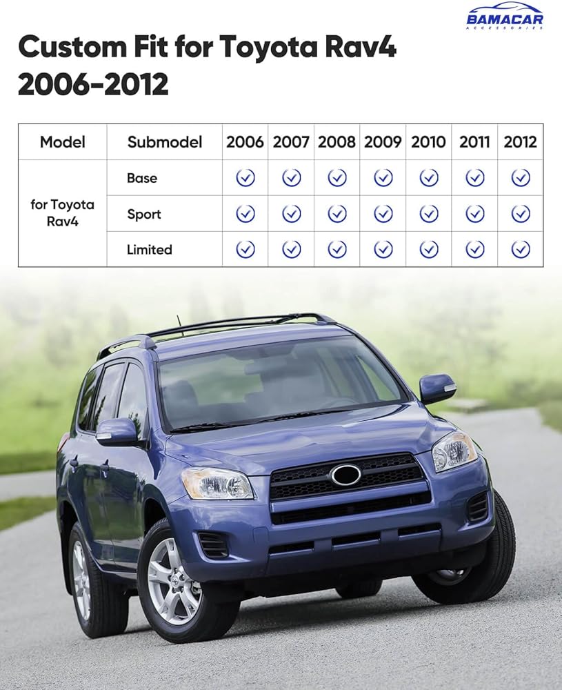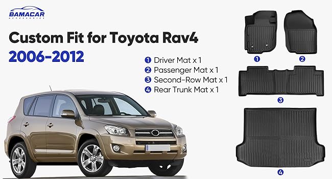 Tailored Fit : Engineered for Toyota RAV4 2006 2007 2008 2009 2010 2011 2012(5-seat without 3rd row seat), these floor mats & trunk liners provide a seamless, factory-matched installation. Our full set rubber floor liner for RAV 4 2006-2012 includes 1 driver seat floor mat, 1 passenger seat floor mat, 1 second row floor mat and 1 trunk mat, all packed together in a box