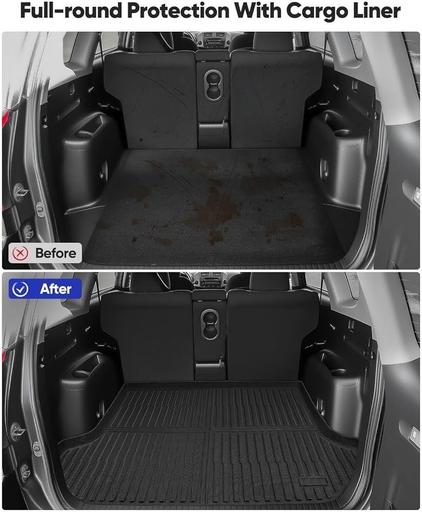 Effortless Maintenance & Installation : Cleaning is effortless and simple: just take out the all weather front second row and cargo mat for RAV-4, give them a thorough rinse with soap or water, and then wipe or air dry. Installation is easy , just remember to take out your vehicle's original mats first to allow these custom liners to sit flat