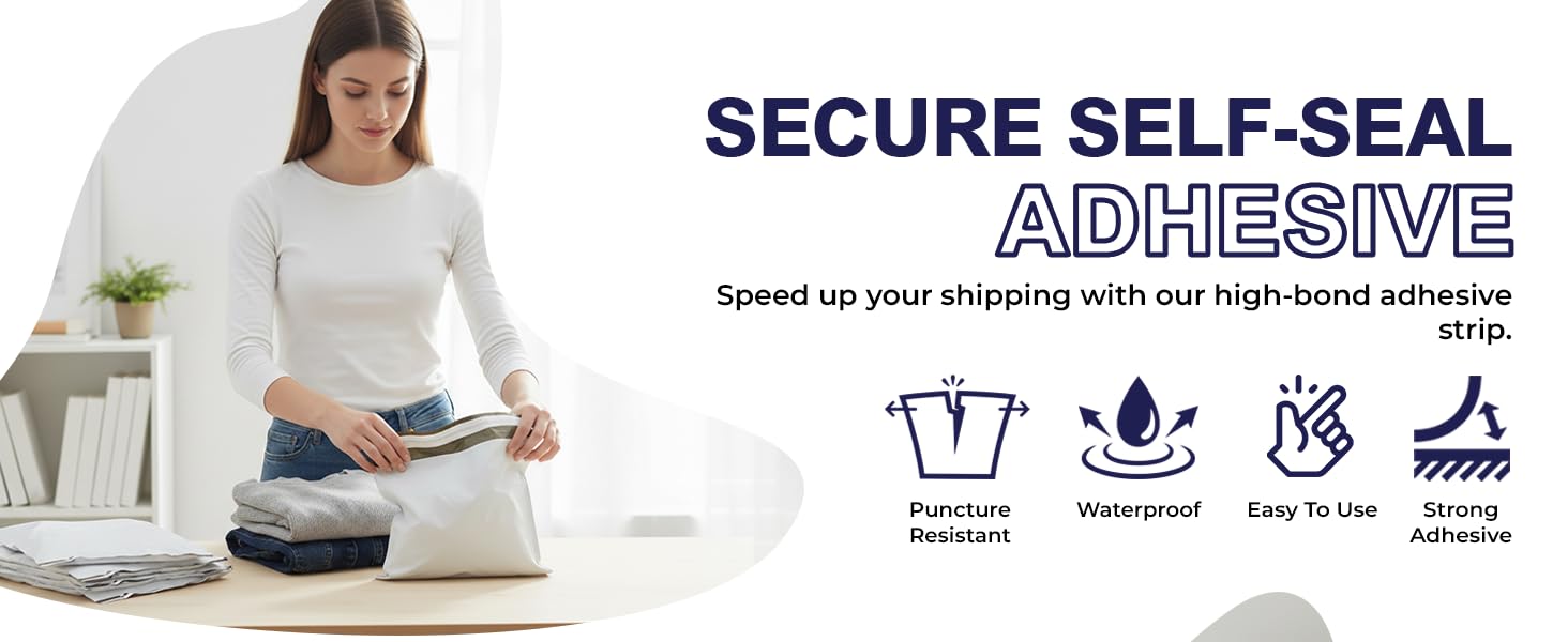 SECURE SELF-SEAL ADHESIVE Speed up your shipping with our high-bond adhesive strip. Once closed, the tamper-evident seal stays locked in extreme temperatures, eliminating the need for extra tape and messy packing supplies.