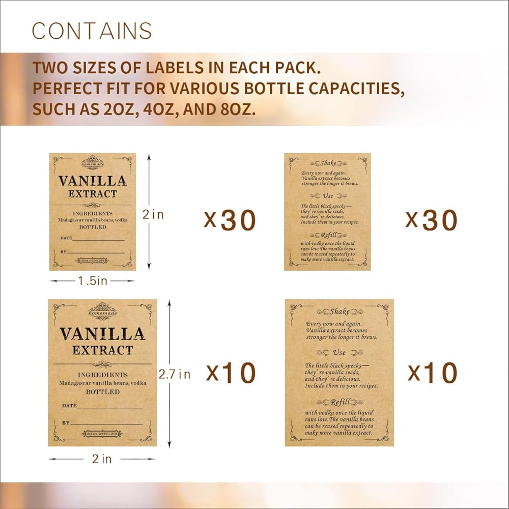 Two Sizes in Each Pack:We've designed two sizes of labels in each pack.1.5x2in,2x2.7in, This thoughtful inclusion ensures a perfect fit for various bottle capacities, such as 2oz, 4oz, and 8oz. No matter what size of handcrafted vanilla bottle you have, our labels will adorn it beautifully.