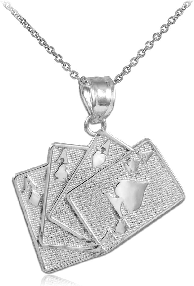 Go all in with this fashionable four of a kind playing cards charm poker pendant necklace. Expertly polished to perfection, this luxurious charm is a hand you don't want to lose. Whether your personal favorite is Texas Hold 'em, Omaha, or 7-Card Stud, win big in poker and in any other casino card game with this good luck charm pendant necklace .