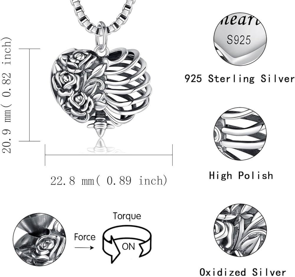 Heart Shape Rose Rib Cage Urn Necklaces for Ashes 925 Sterling Silver-Gothic Cremation Jewelry Memorial Gifts for Women