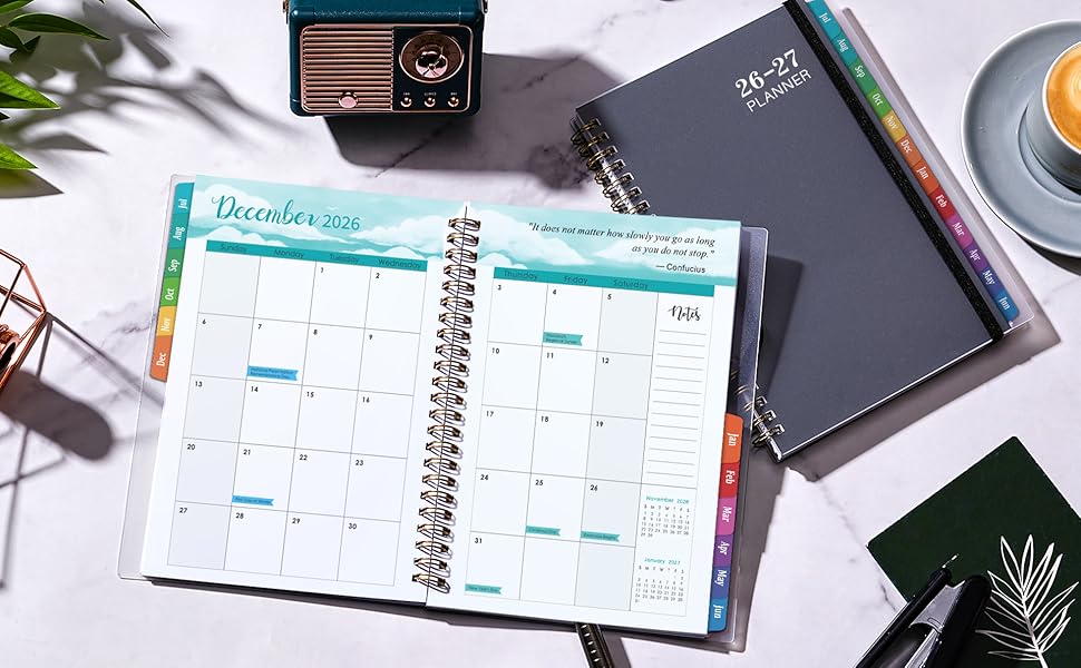 📓 2026-2027 Monthly Page - Each monthly pages of this 2026-2027 planner is thoughtfully designed with a comprehensive overview, featuring 1.18" x1.28" ruled daily blocks and highlighted holidays for detailed planning. Inspirational quotes of the month will keep motivating you, the previous and next month calendars reference for a simple past reviewing and future planning.