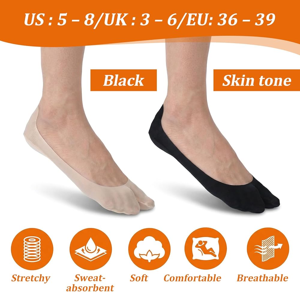 【Anti-Slip Heel Grip】A key functional aspect of these no-show tabi socks is the silicone strips on the inner heel area. It also adopts a 3D wrapped heel structure: this design snugly encloses the heel, while the silicone boosts friction against skin and shoe linings. You will receive 4 pairs women invisible hidden socks, these women's non-slip socks are suitable for shoe size 5-9.