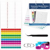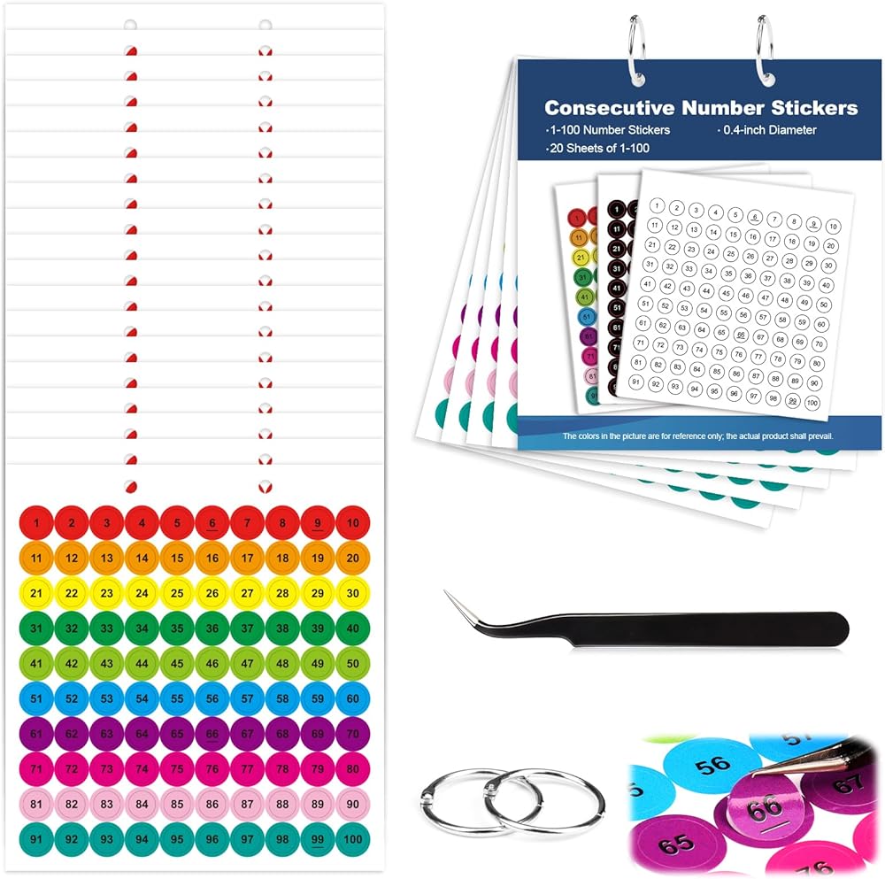 "Easy to Use & Neatly Organized The set includes silver rings and a cover to neatly hold your consecutive number stickers together—easy to carry and access without creasing. Use the included tweezers to easily peel and stick the labels. They adhere well to most surfaces like paper, boxes, and plastic, and remove cleanly without residue."