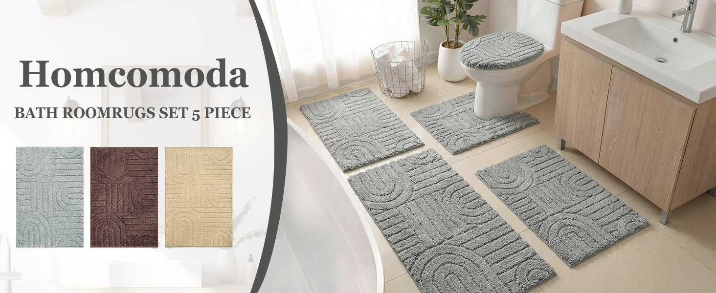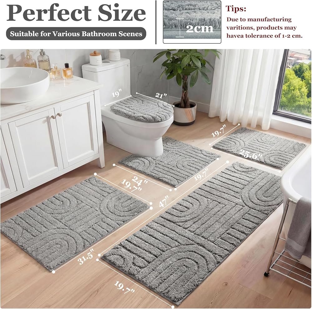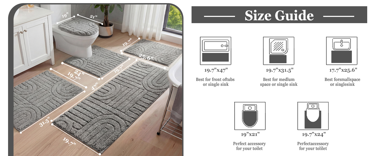 【Bathroom Rugs Sets】Bathroom rug set 5 pieces included 17.7'' x 25.6'', 19.7'' x 31.5'' and 19.7'' x 47'' bath rug runners, 19.7'' x 24'' U-Shaped counter rug, and 19'' x 21'' toilet lid cover. Several size and color rugs for choosing will perfectly match your bathroom,living room,vanity etc, also be the great gift ideas for friend, family.