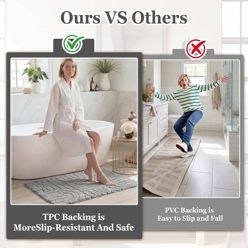 【Ultra-Soft Absorbent Bathroom Mat】Our plush bath rugs for the bathroom showcase a dense pile of absorbent fibers that effortlessly soak up water, the thick and soft pile soothes tired feet and makes you feel like you are on a cloud. They can quickly absorbs water from your feet as you step out of the tub or shower and keeps your floors dry.