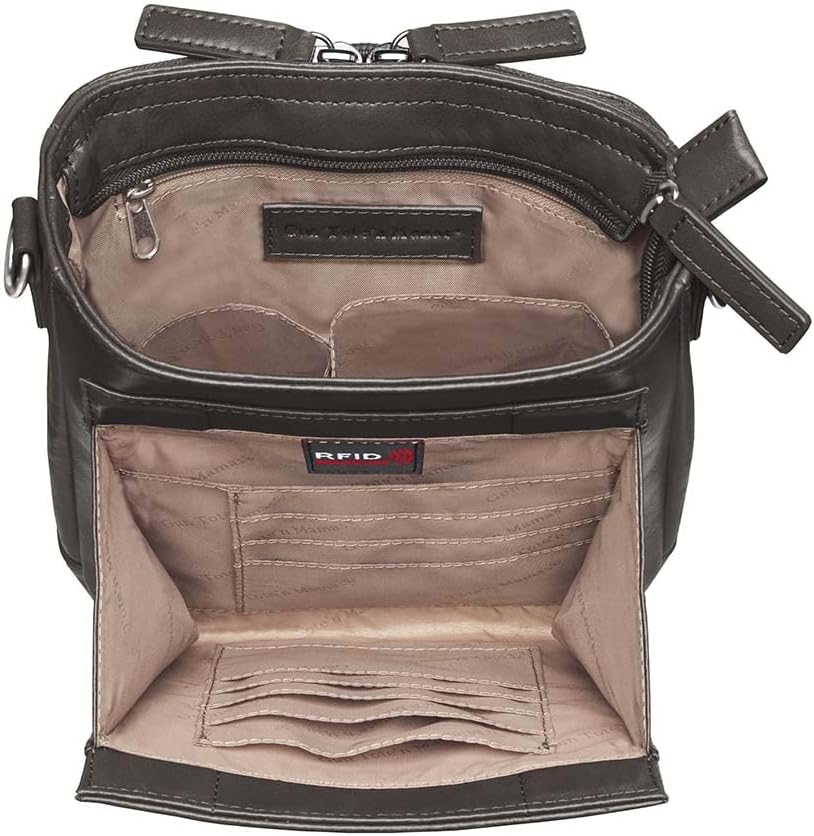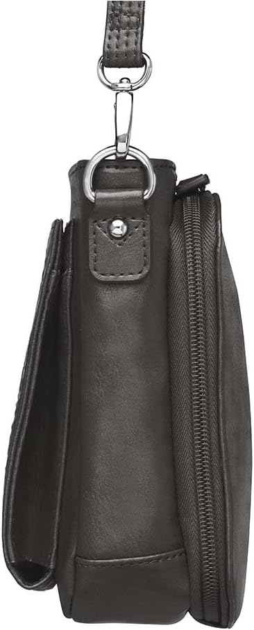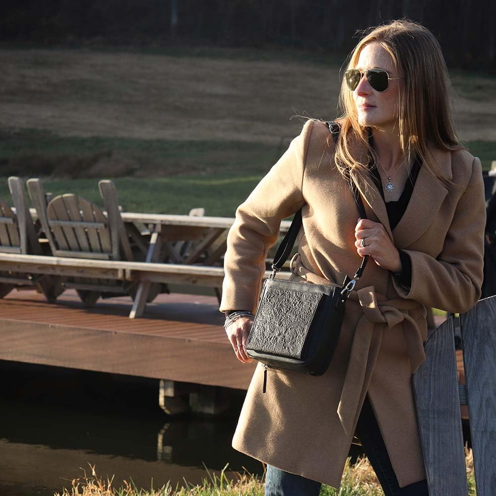 The Gun Tote'n Mamas BOHO Mini Crossbody is a Bohemian style purse that is casual and elegant at the same time. The front panel debossed pattern was created by Gun Tote'n Mamas to symbolize joy, hope and long life. With a 3-sided zippered gun compartment the BOHO Mini Crossbody is fully ambidextrous. Crafted from a washable cowhide with a proprietary finish, the BOHO Mini Crossbody is easy to maintain and gets softer with use. The Wallet Organizer pocket is RFID protected and features credit card/gift card pockets, a larger pocket for receipts, and is held closed by rare-earth magnets. The Main Compartment has a zippered top closure and features two inside open pockets and a zippered pocket for all the little things, like a knife, flashlight, pepper spray. For simple elegance in concealed carry, look no further than Gun Tote'n Mamas.