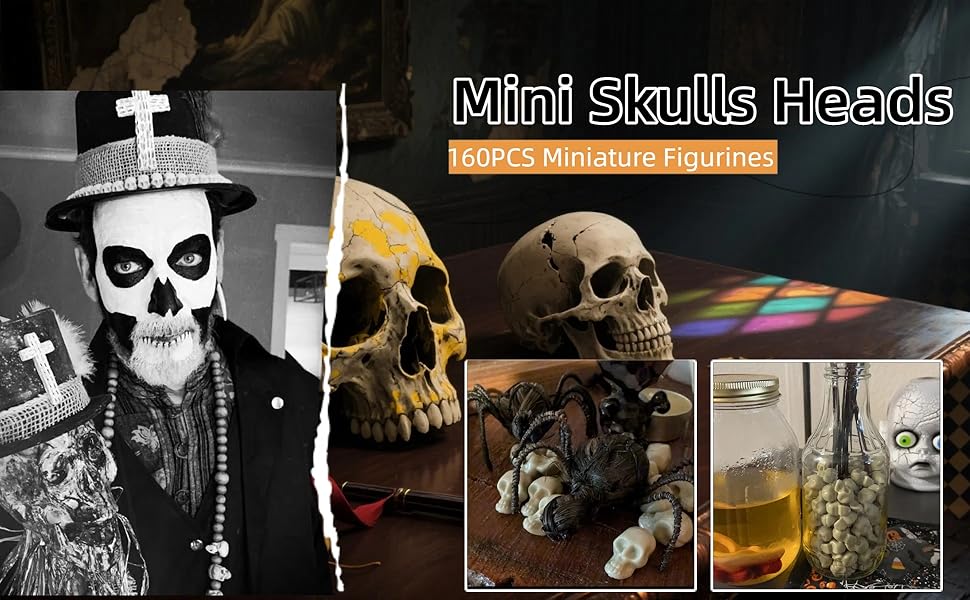 PACKAGE CONTENTS: Set includes 160 pieces of miniature plastic skull heads perfect for Halloween decorations and creative projects