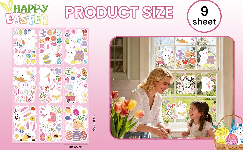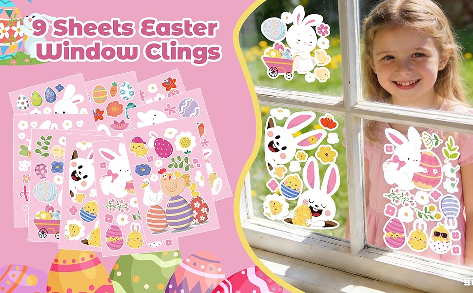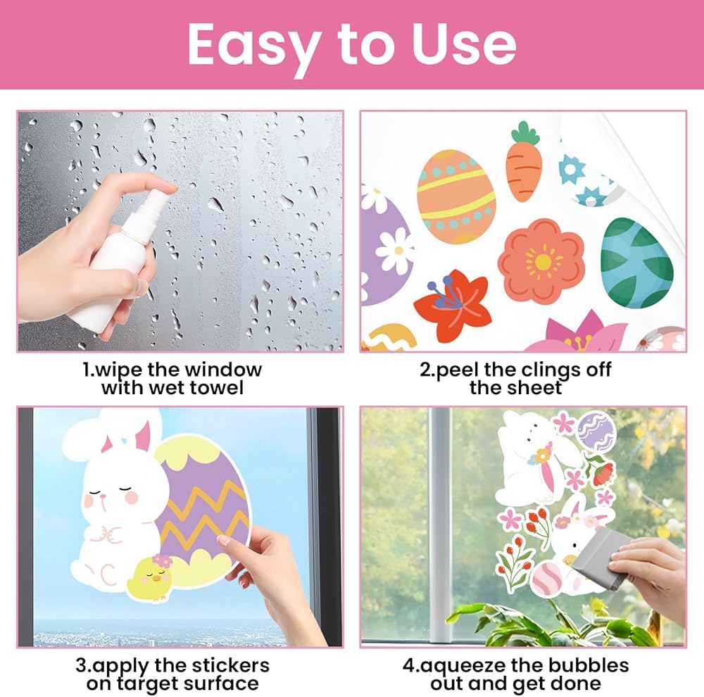 【Quick & Easy Application】Simply clean the glass, spray with water, and press these Easter window stickers into place; no glue or tape needed for a secure hold that won't easily fall off