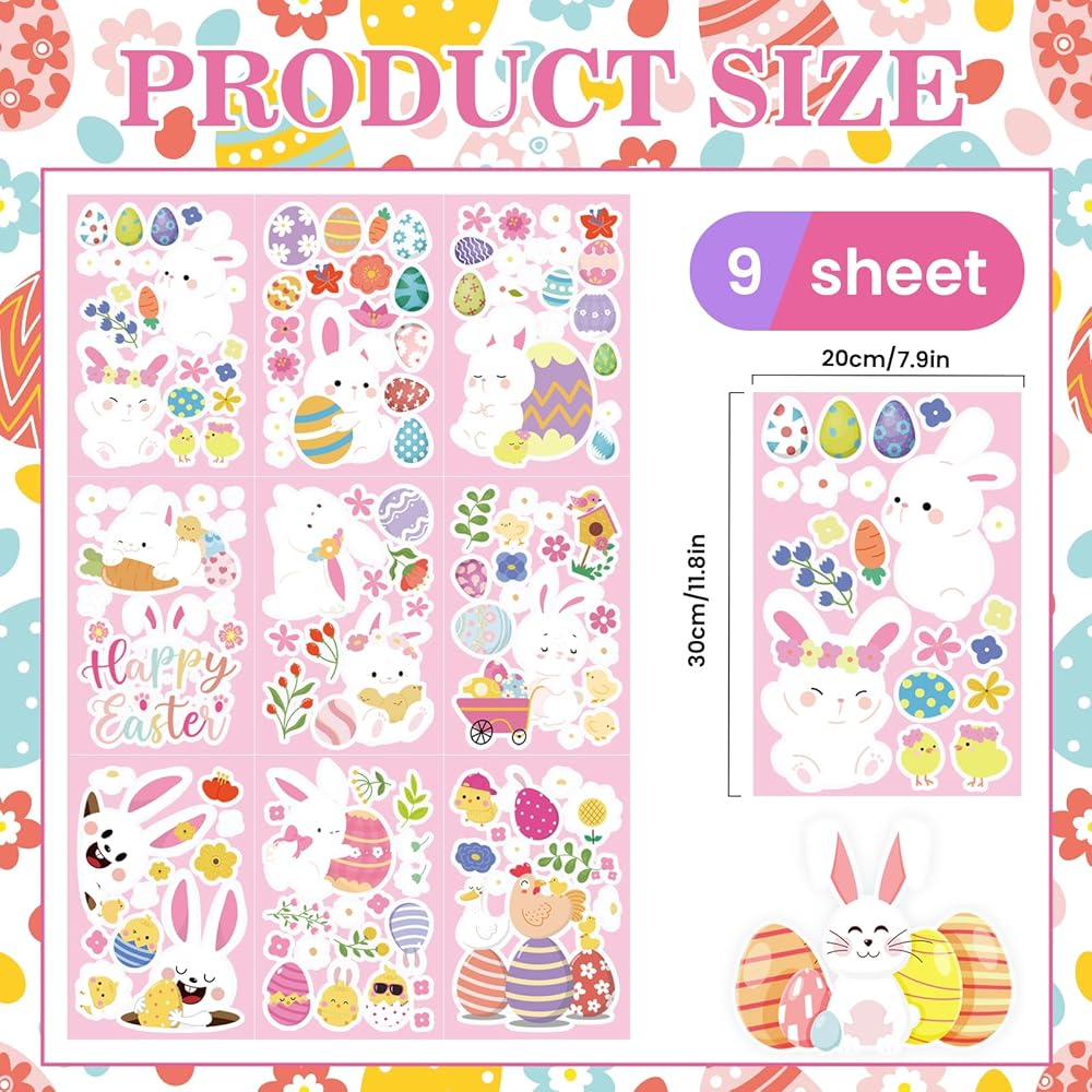 【Complete Easter Decor Set】9 sheets Easter window clings featuring a vibrant mix of bunnies, eggs, flowers, and 'Happy Easter' greetings, providing abundant variety for creating a festive atmosphere with these Easter window decorations
