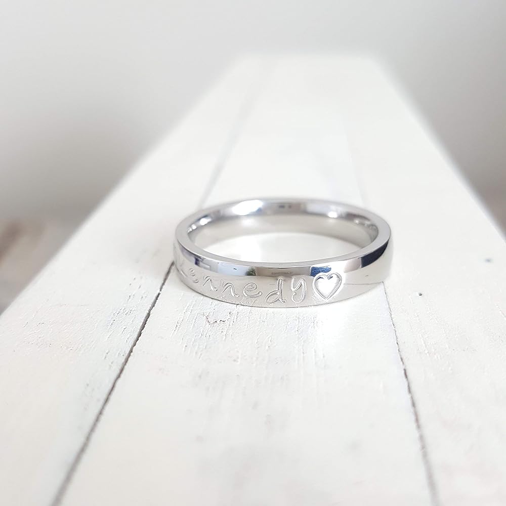 This beautiful ring is made from Stainless Steel and will last a lifetime! It has a Comfort fit band and comes with a polished finish. This can also come in a brushed finish. Please leave me a note at checkout The ring measures 4 mm wide and will come with your name of choice with a two hearts Whole sizes only Custom requests welcome !