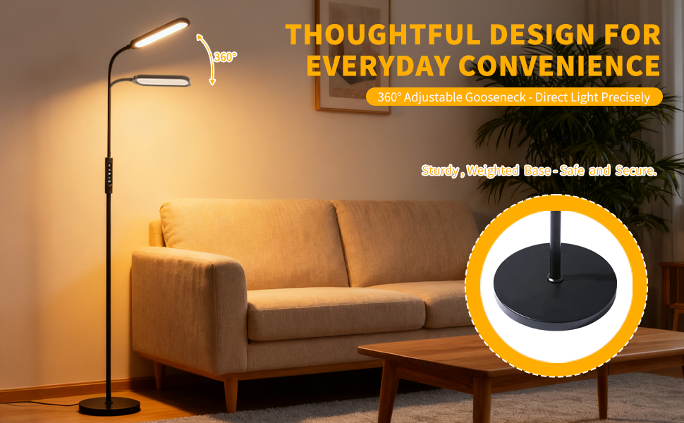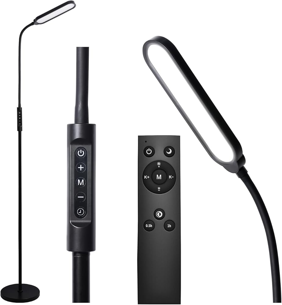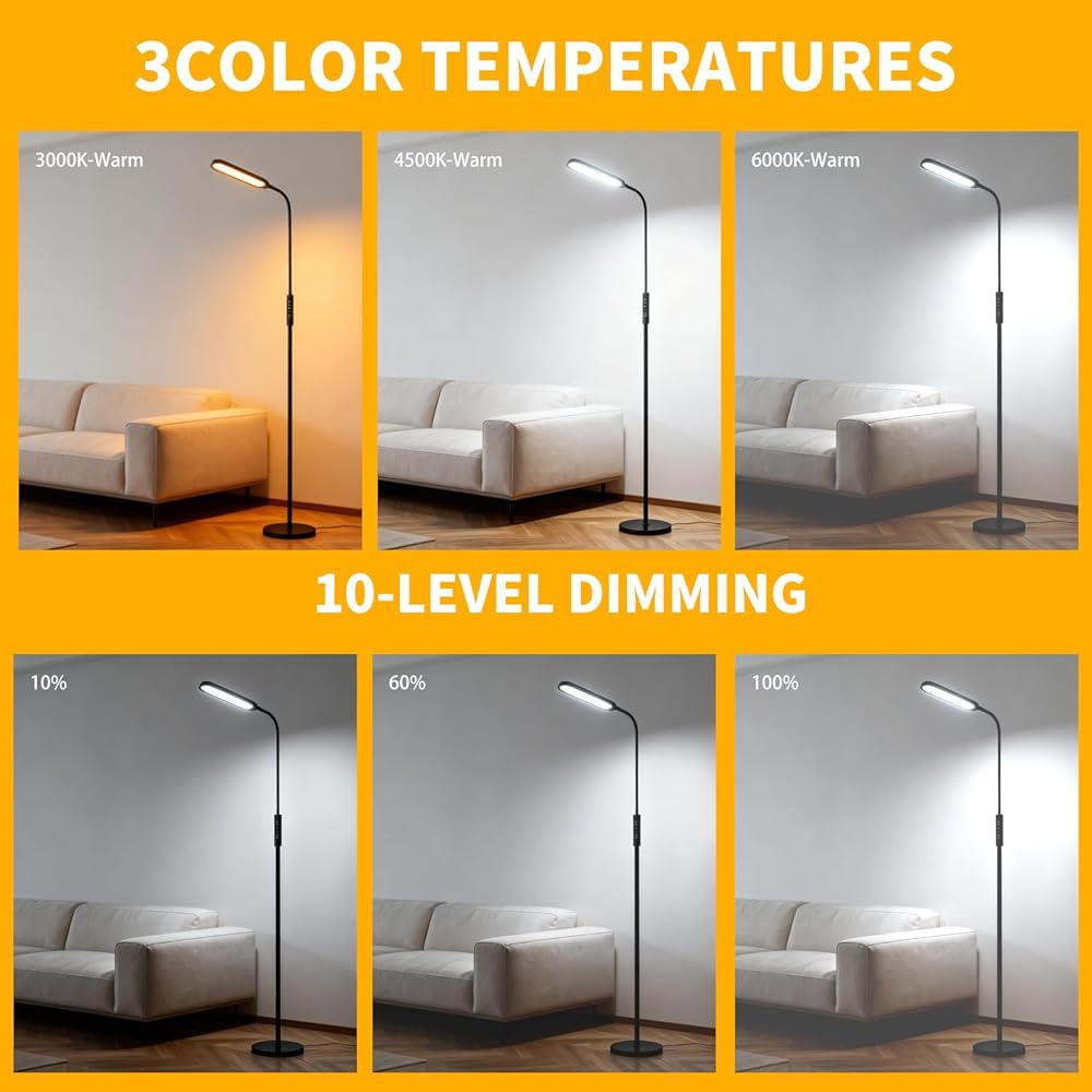 🟢 Fully Adjustable Gooseneck & 3 Lighting Modes The flexible gooseneck floor lamp allows you to easily direct light exactly where you need it. Choose from 3 color temperatures—3000K (warm white), 4500K (natural white), and 6000K (cool daylight)—making it perfect for use as a living room lamp, bedside reading light, or even a professional tattoo light.