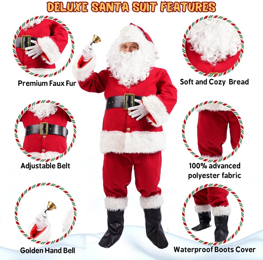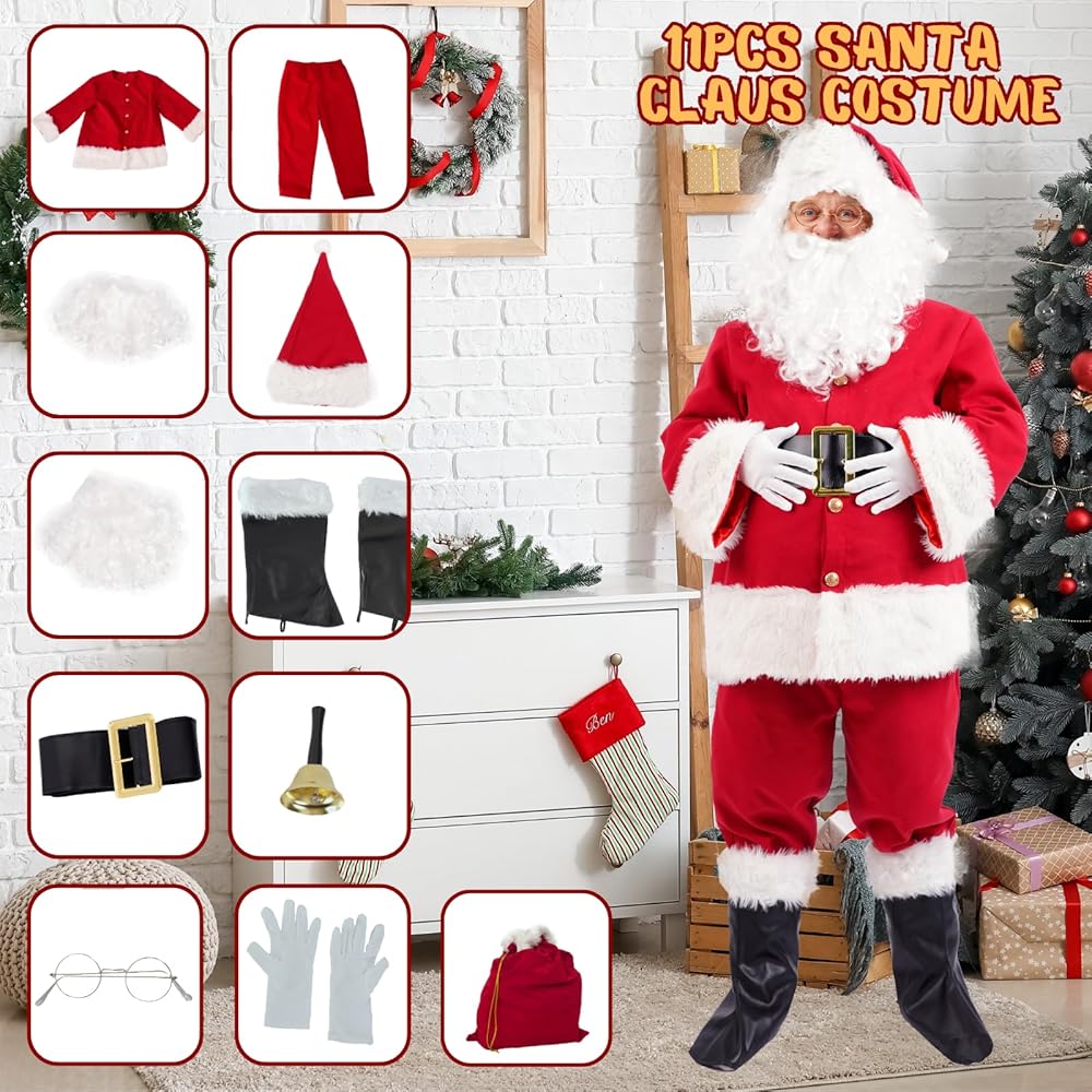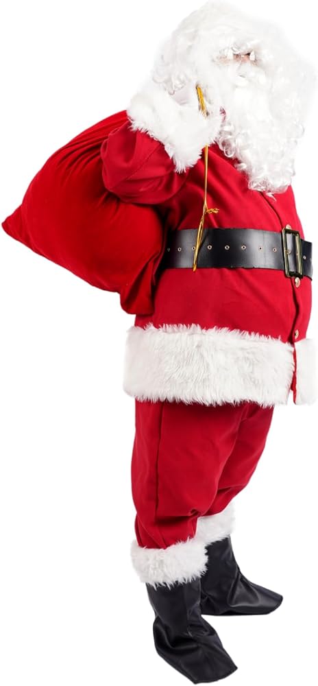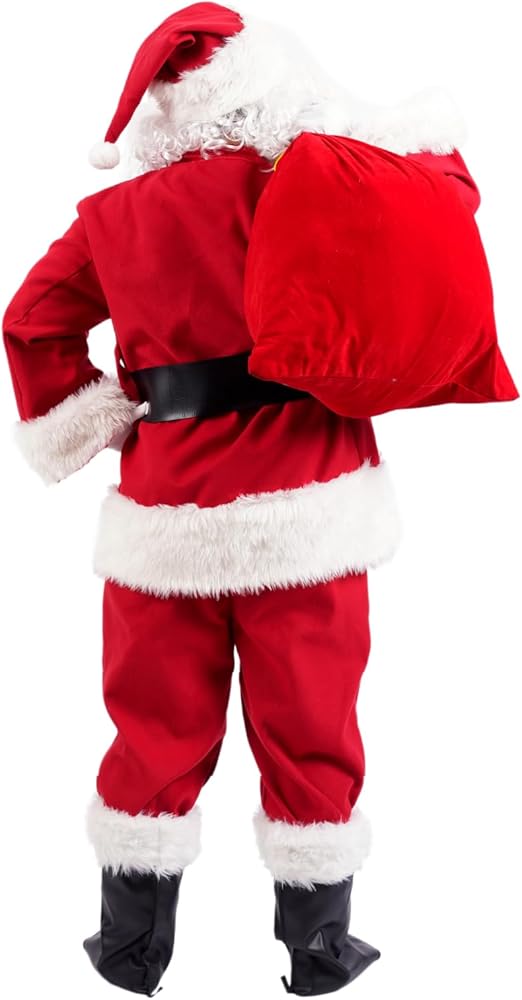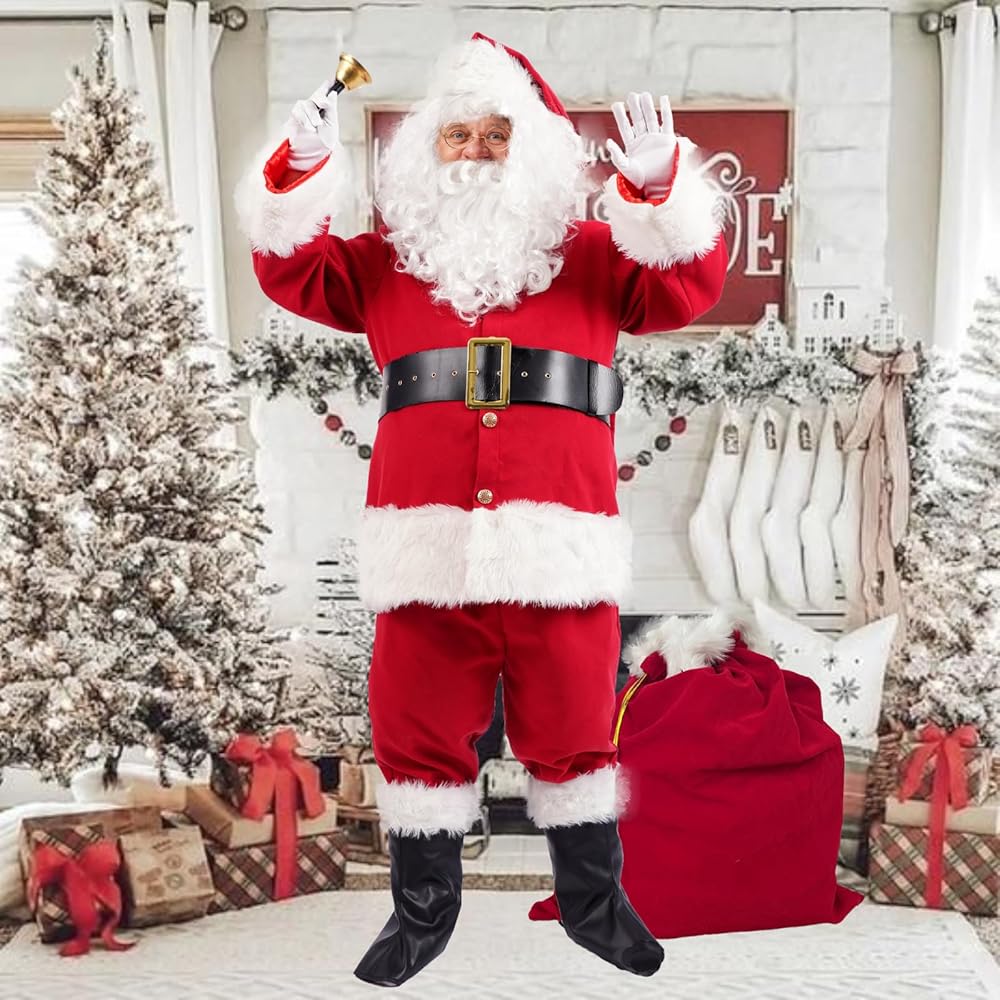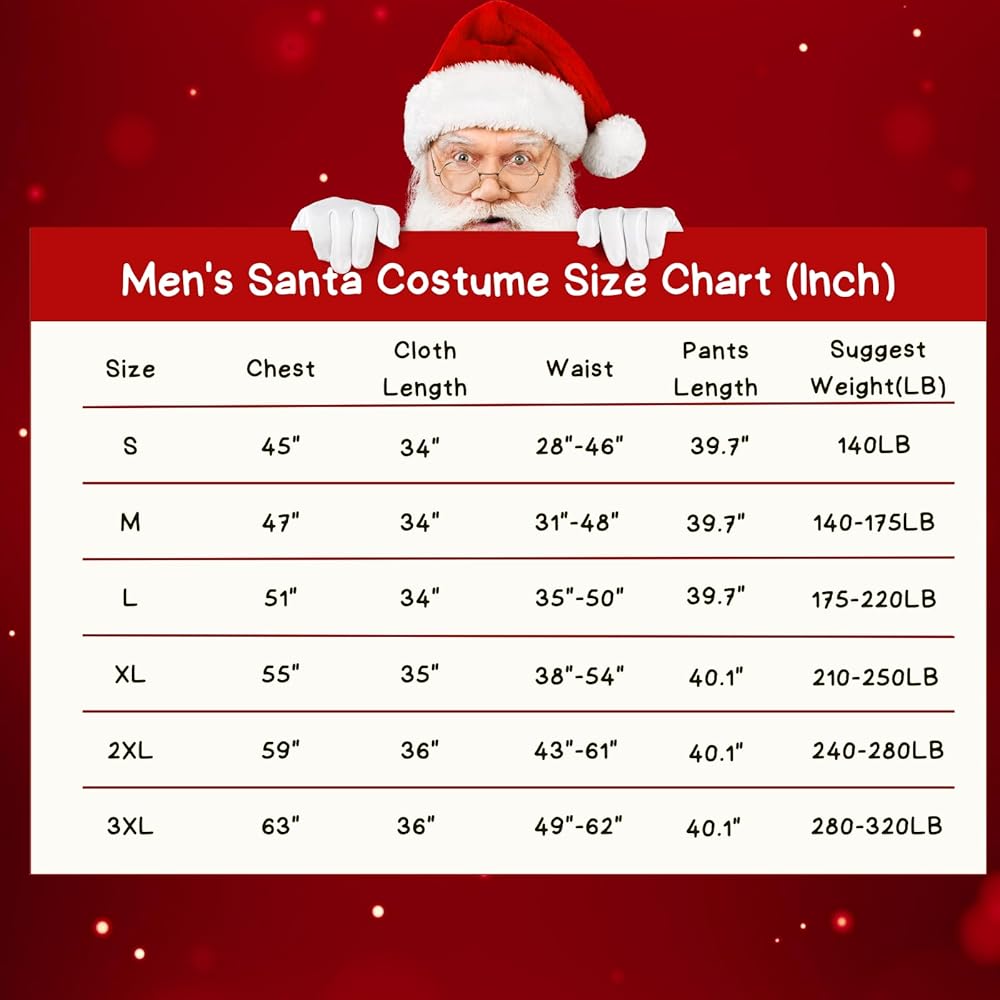 Made from high-quality red velvet, this costume is soft and comfortable to wear. It comes in six sizes ranging from small to 3XL, ensuring that everyone can find the perfect fit. The plush fabric feels great against your skin, so you can enjoy the festivities without any discomfort. The costume features an authentic Santa Claus design that's sure to delight and enchant. The bright red color, white trim, and fluffy cuffs and hem all come together to create a timeless look that everyone will love. Wear it for a festive family photo or while handing out presents to your loved ones. This sexy Santa Claus costume set comes complete with everything you need to embody the spirit of the season. Included are a red velvet jacket, elastic pants with pockets, matching boots with white plush cuffs, a metal buckle belt, gloves, classic glasses, a bell, a white wig, a white beard, and a big red gift bag. With all these items included, you'll have everything you need to transform into the jolly old man himself. Whether you're hosting a Christmas party or just looking for a fun way to embrace the holiday spirit, this Santa Claus costume is perfect for you. It's great for kids and adults alike, and is sure to bring joy wherever you go. In summary, our Santa Claus Costume for men is the perfect outfit for anyone looking to spread Christmas cheer this holiday season. With its comfortable and high-quality materials, authentic design, and complete gift package, it's the perfect choice for any holiday event. So why wait? Order yours today and get into the festive spirit with this fun and cozy costume set!