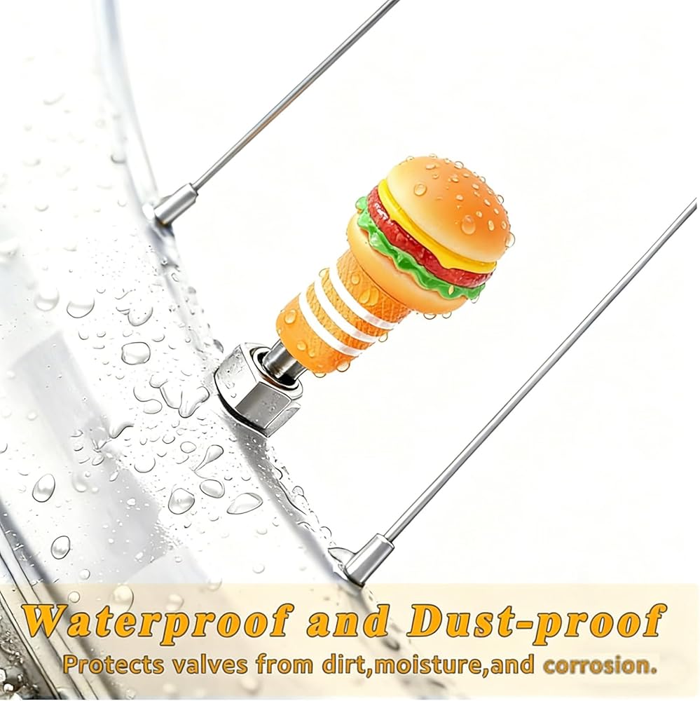 This set of 4 creative tire valve covers features a lifelike 3D hamburger design. They easily replace standard black valve caps, adding a playful, adorable personal touch to your wheels. A perfect little gift for car owners or cycling enthusiasts.