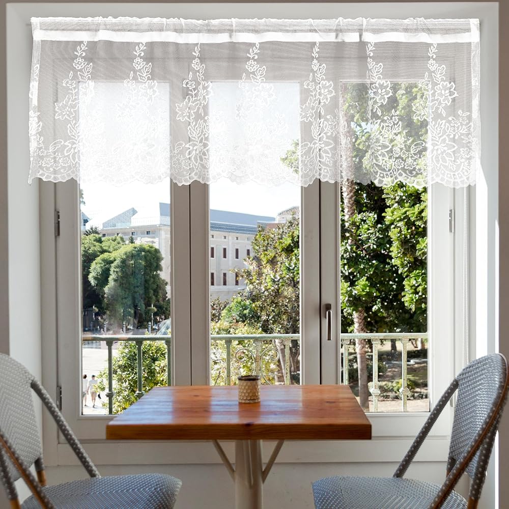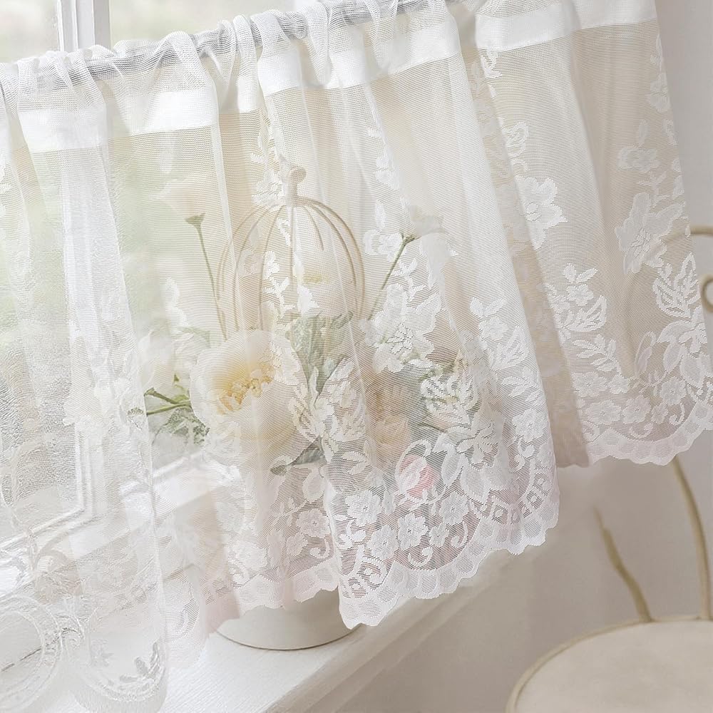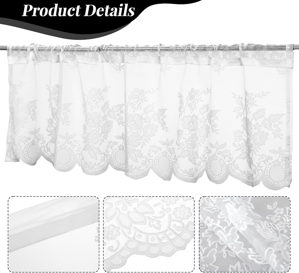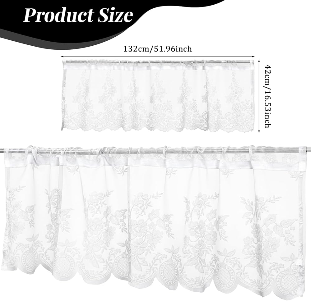 Kitchen Valances Size:With dimensions of 51.96 x 15.74 in,this size makes our lace valances suitable for various window types. The Weight of white valances is only 0.16 pounds, it is lightweight,so you can easily put the floral curtains into the curtain rod by yourself.