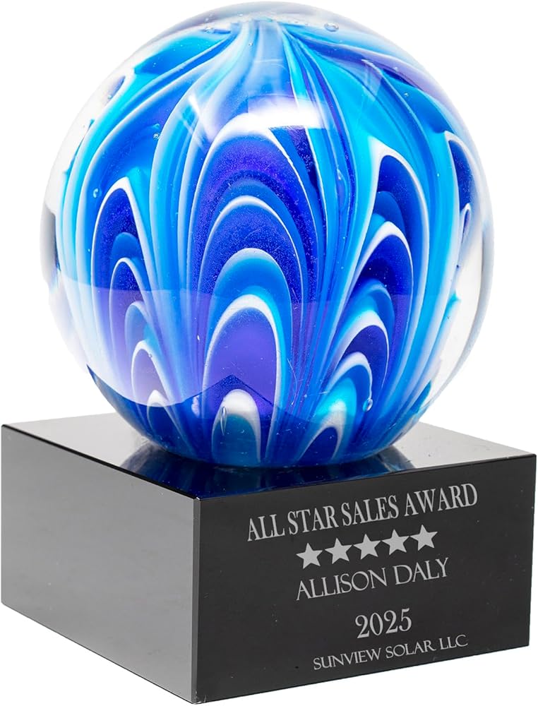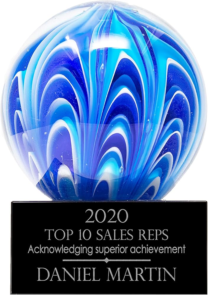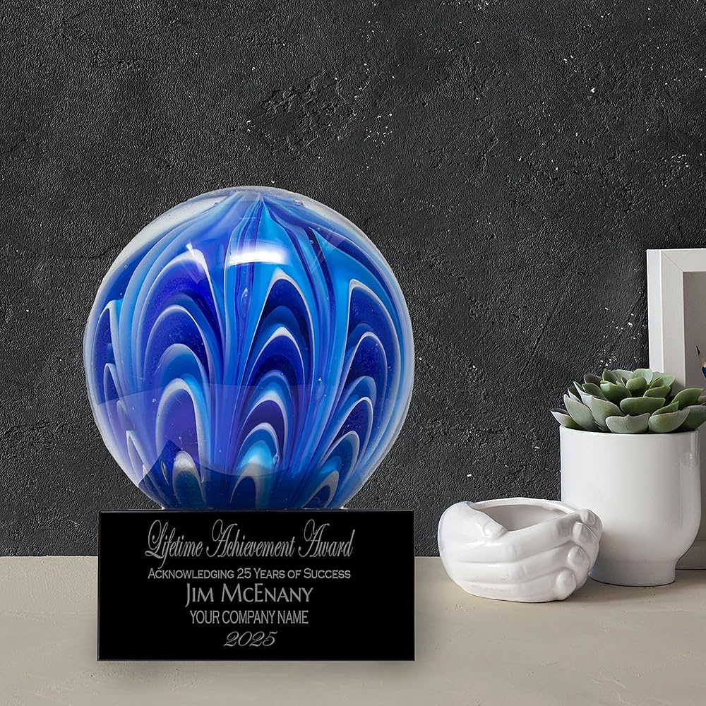 Each piece features a hand-blown glass sphere swirled with rich hues of light and dark blue accented by white, creating a mesmerizing marbled effect. Resting on a solid black glass base, the award feels substantial and elegant, offering both artistry and professionalism. Its spherical shape represents unity, completeness, and balance—ideal for honoring those who make a lasting, well-rounded impact.