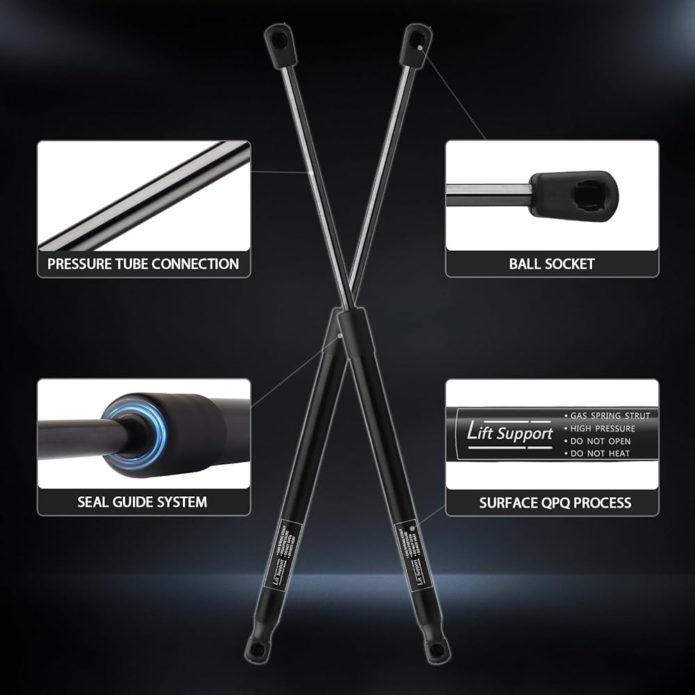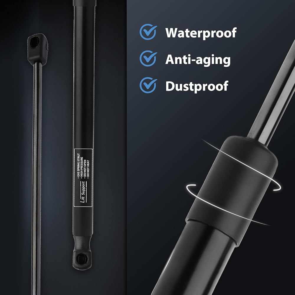 【Reliable Gas Struts】Every Strut is meticulously crafted from heavy gauge Steel Pistonm, thickened precision seamless steel cylinder body and high-pressure bearing OE quality end socket, which will undergo over 30 rigorous testing procedures including 96-hour salt spray test and an 18000 compression test, will provide the most reliable gas struts to support you no matter in Sunshine, Rainy or Snowy Day!