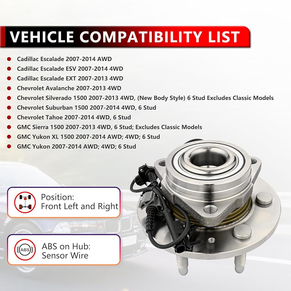 COMPATIBLITY-Front Wheel Bearing Hub Assembly Replacement For 2007-2013 Chevrolet Avalanche 4WD; For 2007-2013 Chevrolet Silverado 1500 4WD, (New Body Style) 6 Stud Excludes Classic Models; For 2007-2014 Chevrolet Suburban 1500 4WD, 6 Stud; For 2007-2014 Chevrolet Tahoe 4WD, 6 Stud