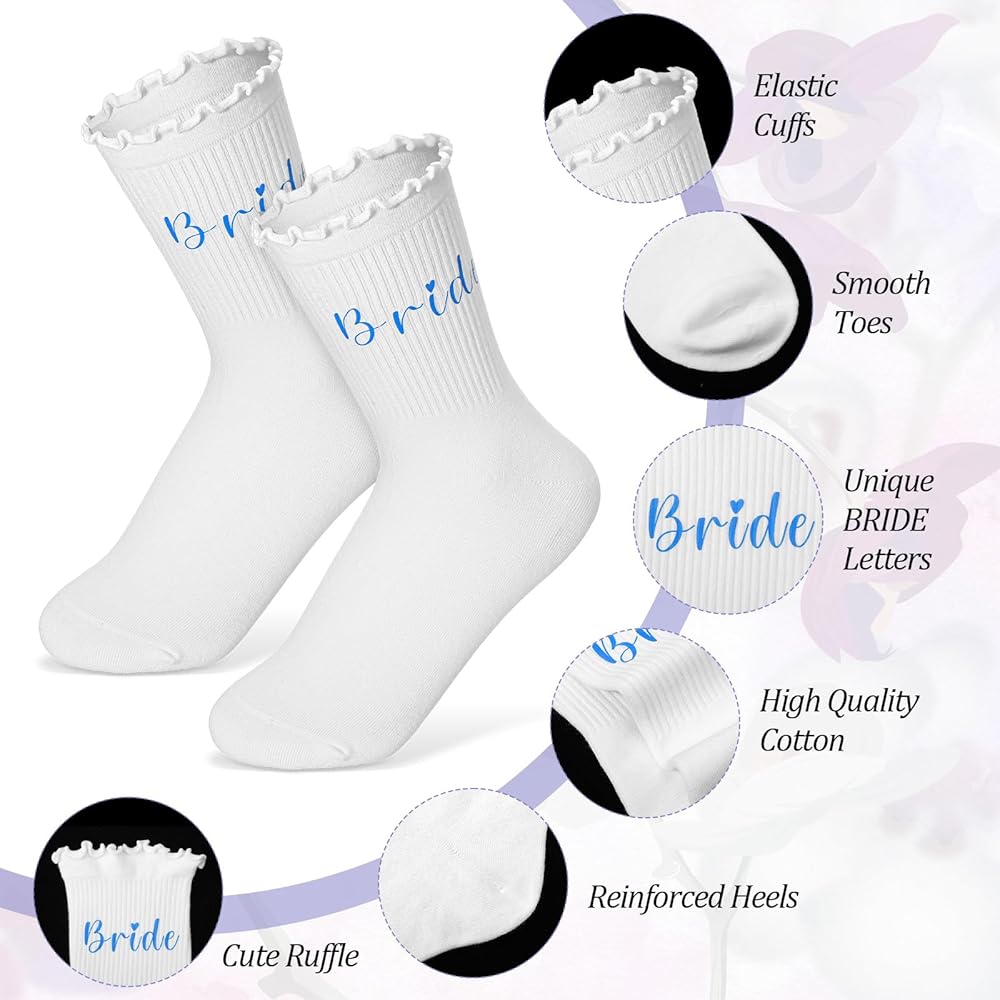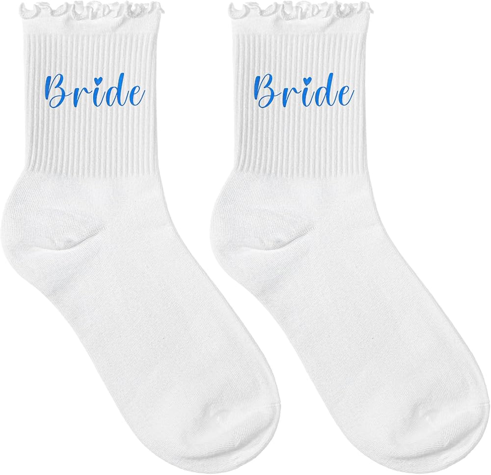 Unique Design: The white frilly socks feature a unique ruffled edge design, decorated with a cute blue "bride" lettering, adding a romantic and adorable touch, making it an indispensable fashion item for the wedding day.
