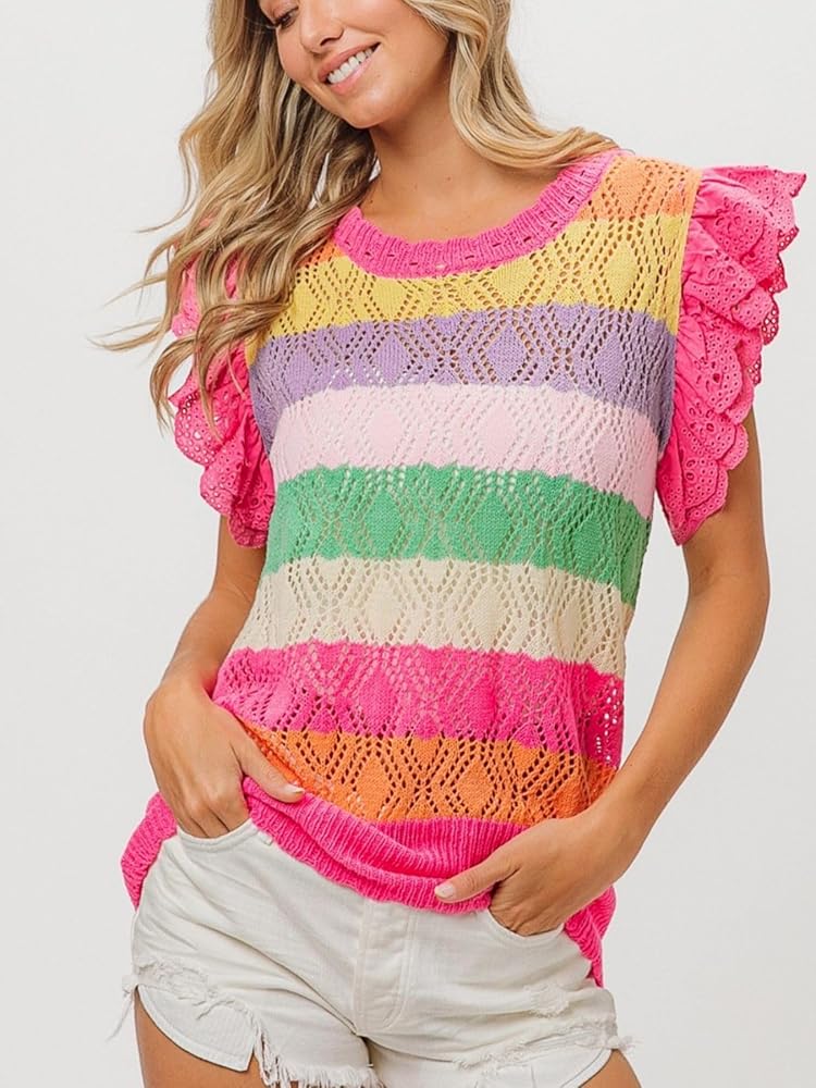 Elevate your style with this charming Pointelle Striped Ruffled Knit Top. The delicate pointelle knit design and striped pattern combine for a feminine and sophisticated look. Featuring ruffled accents for a touch of elegance, this top is perfect for adding a romantic flair to your outfit. The lightweight knit fabric provides comfort and breathability for all-day wear. Pair it with your favorite bottoms for a polished and fashionable ensemble. Make a fashion statement with this Pointelle Striped Ruffled Knit Top, a must-have piece for any fashion enthusiast.