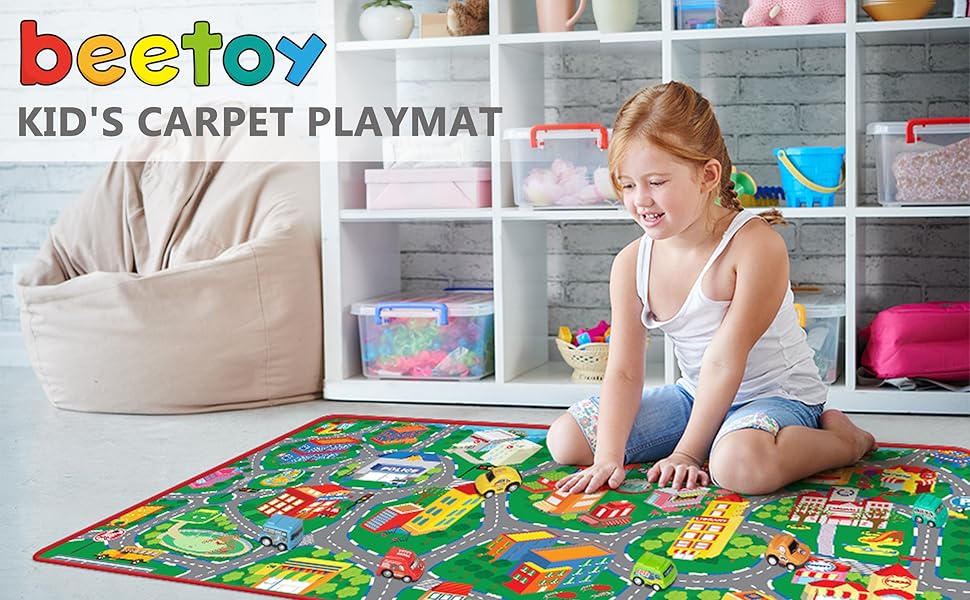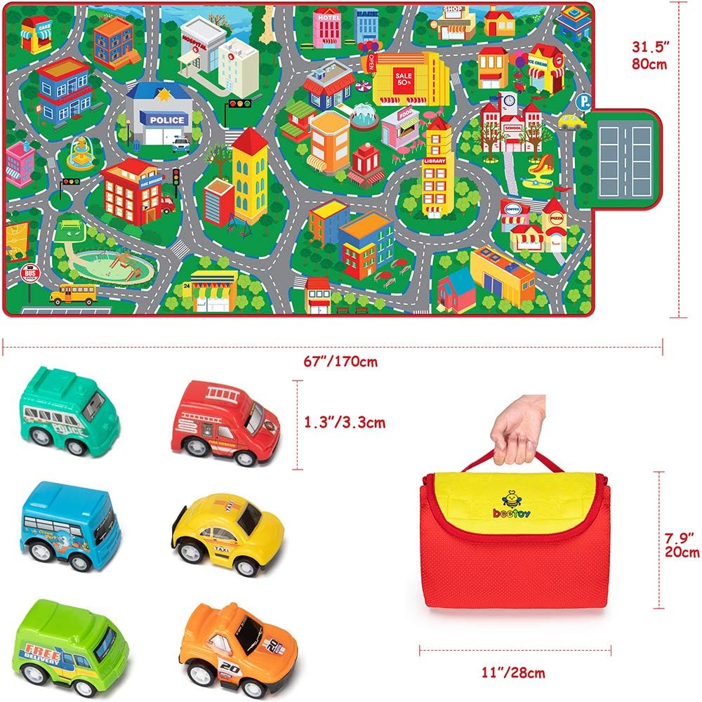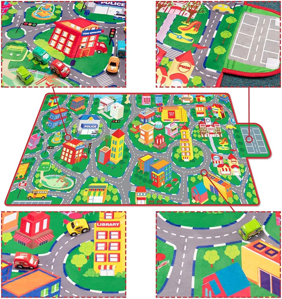 Explore a Vibrant City Life: Our 59'' X 31'' Car Rug Play Mat features colorful graphics of hospitals, schools, churches, parks, streets, traffic lights, parking lots, and playgrounds. Comes with 6 brightly colored toy cars for kids to play on. Other small toy cars and trucks also fit perfectly with this traffic car rug play mat.