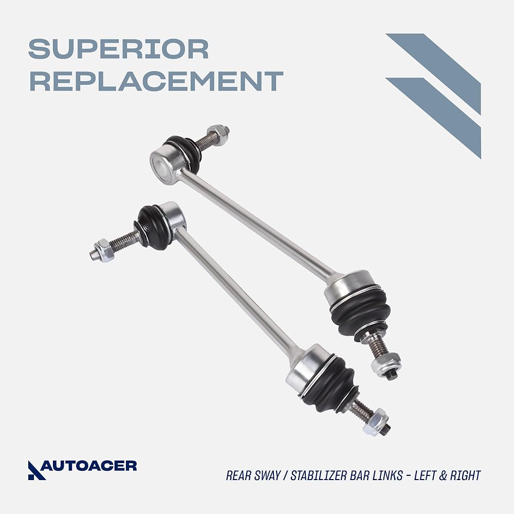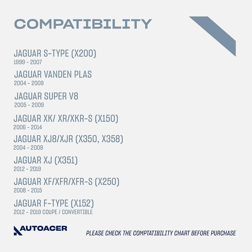 AUTOACER 4-Piece Rear Suspension Torque Rod and Stabilizer Link Kit is designed as a replacement suspension component set for compatible vehicles including S-Type, XJ, XK, XF, and F-Type models. The kit includes rear torque tie rods and rear stabilizer bar links manufactured with aluminum construction and a powder-coated finish. These suspension components are used within the vehicle's rear suspension system to help connect suspension arms and stabilizer bars while allowing controlled movement of the suspension assembly. The parts are designed as direct replacement suspension components that install in factory mounting locations without drilling or modification when replacing worn suspension links. This rear suspension linkage kit is compatible with 1999–2007 S-Type (X200), 2004–2009 XJ8 and XJR (X350 / X358), 2012–2019 XJ (X351), 2006–2014 XK, XKR and XKR-S (X150), 2008–2015 XF, XFR and XFR-S (X250), 2012–2019 F-Type (X152), 2004–2009 Vanden Plas and 2005–2009 Super V8 models. These suspension linkage components are commonly replaced during maintenance or repair of worn rear suspension arms, stabilizer bar links, or suspension rod assemblies. The kit includes two rear torque tie rod assemblies and two rear sway bar / stabilizer bar links used in the rear suspension system to support suspension alignment and vehicle stability during normal driving conditions. The components are manufactured using aluminum construction with sealed joints designed for typical suspension loads and road conditions. The powder-coated finish helps protect the metal surfaces from corrosion and road debris. This suspension kit corresponds with OE reference numbers including C2D49529, C2D49528, C2D51044, C2D5993, C2C18419, C2C24305, C2D5361, C2D5992, C2Z3208, C2D51041, C2D51043, XR81693, XR81692 and additional related part numbers that may be used for compatibility verification. The components are intended to replace existing rear suspension links while maintaining factory mounting points when installed correctly. The kit contains four suspension parts including two rear torque tie rod assemblies and two rear stabilizer bar links. Professional installation is recommended and a wheel alignment should be performed after installation to ensure proper suspension geometry and tire wear. AUTOACER provides a 2-year manufacturer warranty covering manufacturing defects for this rear suspension component kit.