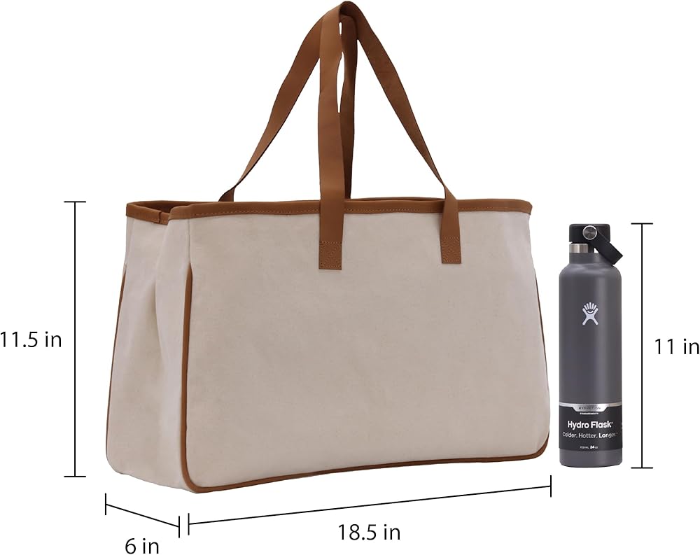 Stylish & Durable Canvas Beach Tote Bag Upgrade your summer essentials with this high-quality canvas beach tote bag, crafted for both style and function. Made from 100% eco-friendly cotton canvas, this bag features superior stitching, water-resistant durability, and easy-to-clean material—perfect for keeping your belongings protected and organized. Key Features: Superior Construction: Built with premium canvas and reinforced stitching for long-lasting use. Water-resistant and washable to handle any beach day mess. Spacious & Practical: Measuring approximately 18.5" L x 11.5" H x 6" W, it's large enough to carry towels, snacks, sunscreen, and everything you need for a day out. Chic & Versatile Style: Lightweight and compact, with a timeless natural color, camel piping, and elegant leather handles that pair beautifully with any outfit. Thoughtful Gift: A stylish, practical gift idea for birthdays, holidays, or special occasions—perfect for your sister, wife, mom, or girlfriend. Multipurpose Use: Ideal for beach days, family picnics, poolside lounging, hiking, sports, gym trips, and weekend getaways. Whether you're heading to the beach or running weekend errands, this tote bag combines fashion, function, and eco-conscious design in one elegant package.