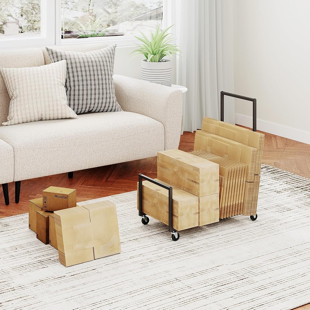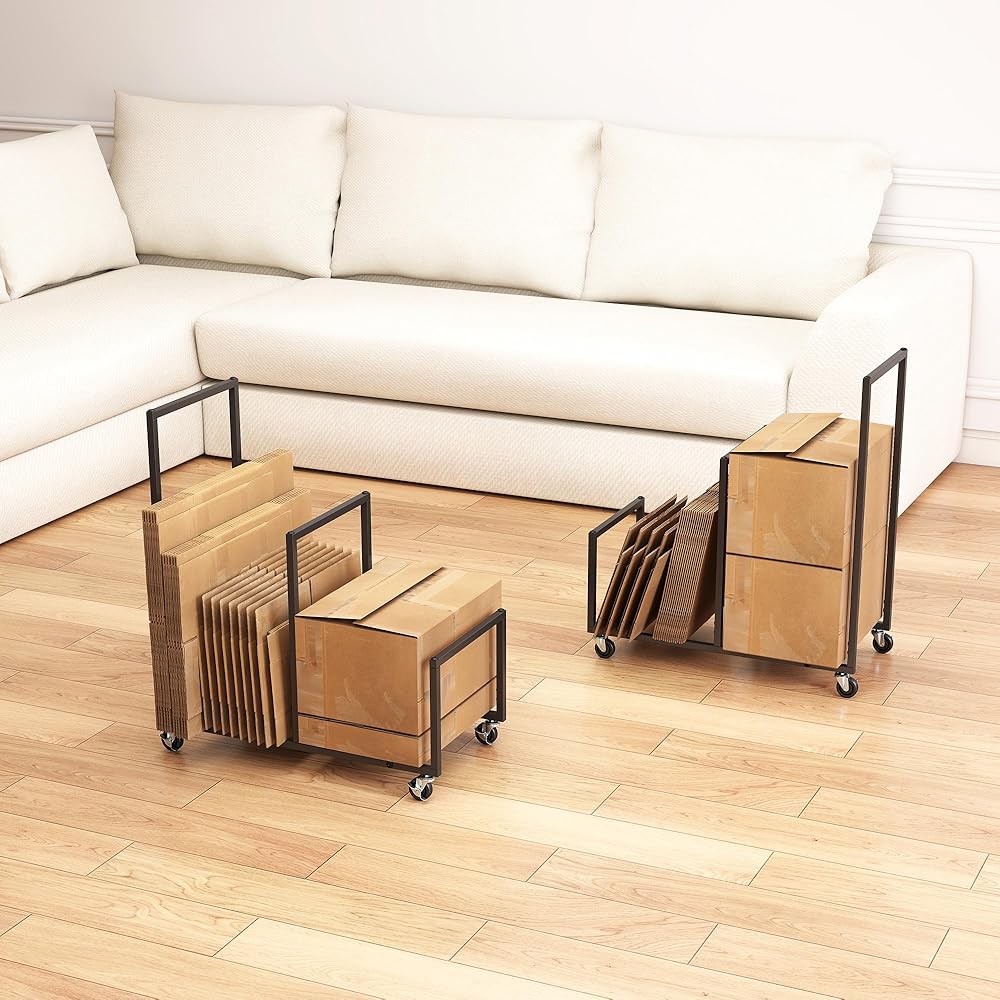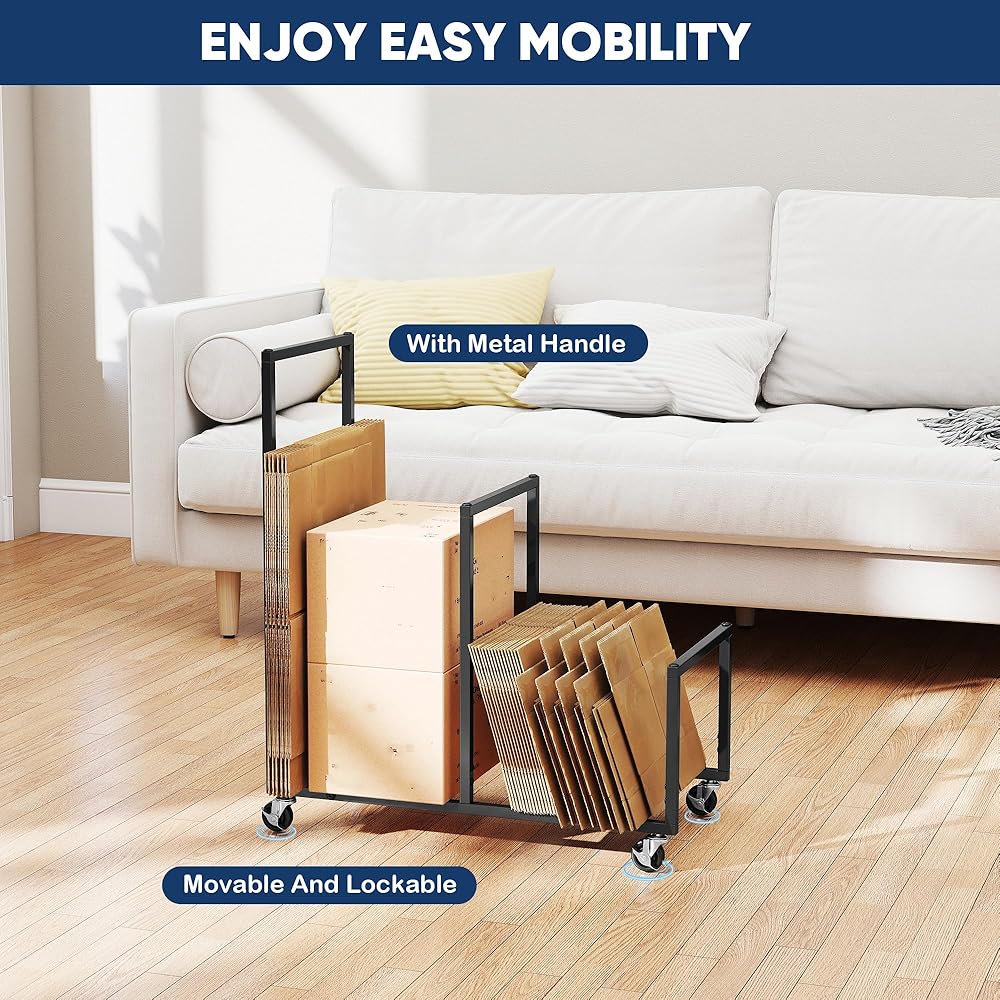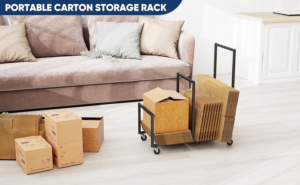 CONVENIENT & FLEXIBLE MOBILITY: This shipping carton storage cart features four lockable 360° rotating casters on its base, allowing you to effortlessly move the box cart to desired locations such as recycling stations. The locking function ensures the cardboard box holder remains securely in place when stability is required