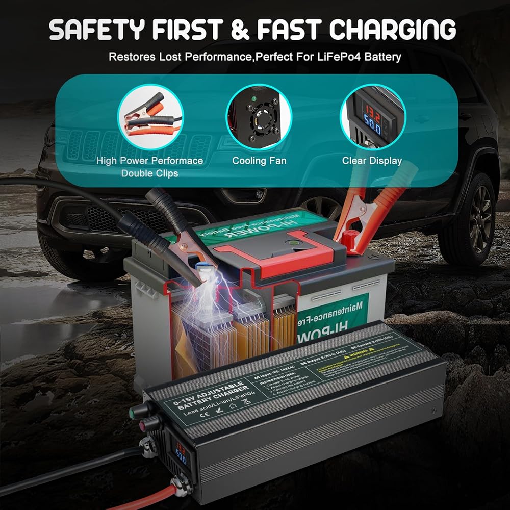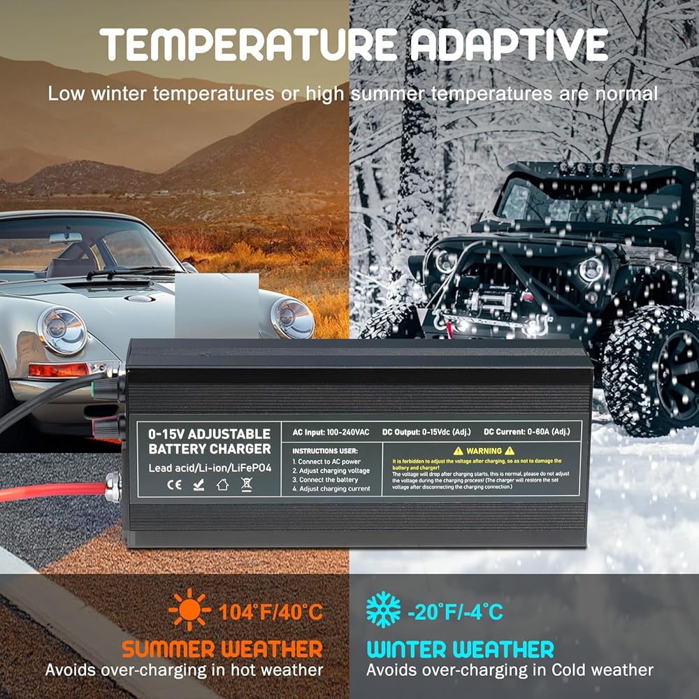 GREAT DESIGN FOR LIFEPO4 BATTERY-- Capacity. Li Smart Charger is specially designed for 12.8V LiFePO4 battery or 12.6V Li-ion battery, the current/voltage both are adjustable, the range is 0-60A / 0-15V adjustable. implementing the special 2-stage constant current/constant voltage (CC/CV) charge algorithm with smart LED indicators. This charger has a specific Pre-Charge function, which is designed to activate all types of BMS by allowing current into lithium batteries reading from down to 0V.