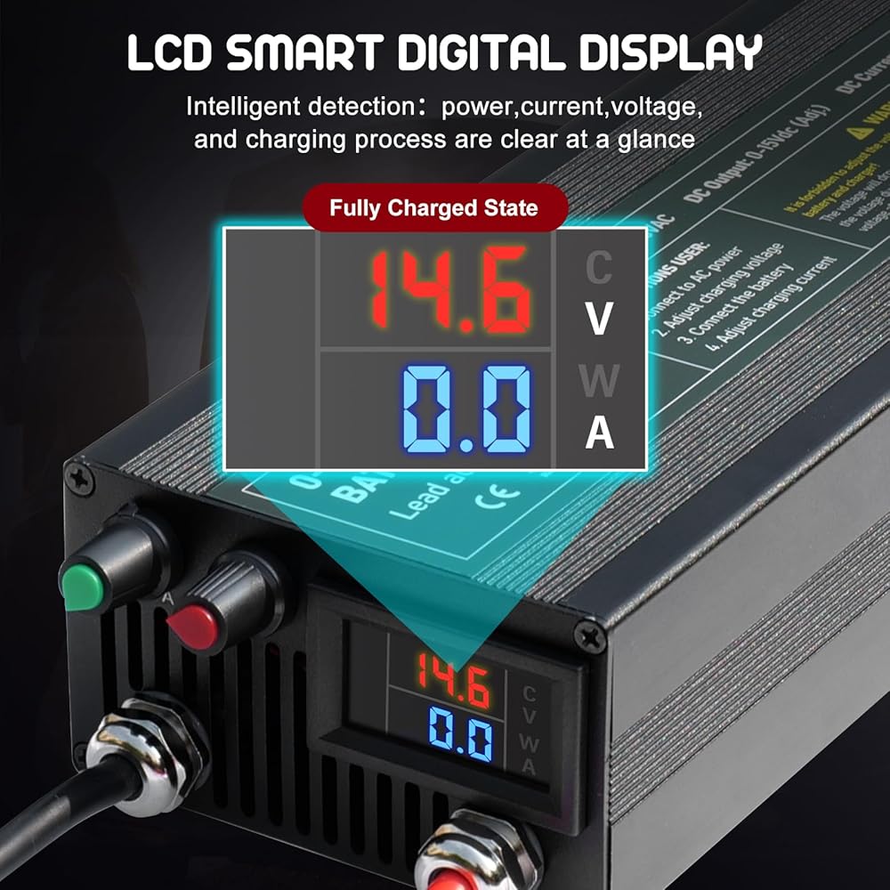 MULTIPLE PROTECTIONS--Capacity. Li 60A 14.6V LiFePO4 lithium batteries charger adopt ABS flame-retardant shell, fireproof, anti-shock, corrosion resistance, sturdy and durable, built in circuit protection, spark free system, reverse polarity protection, over-charge, over-voltage and over-temperature protection. The intelligent LCD display shows the charging status and battery status, so that you can charge more at ease. Please read the instructions carefully before proceeding.
