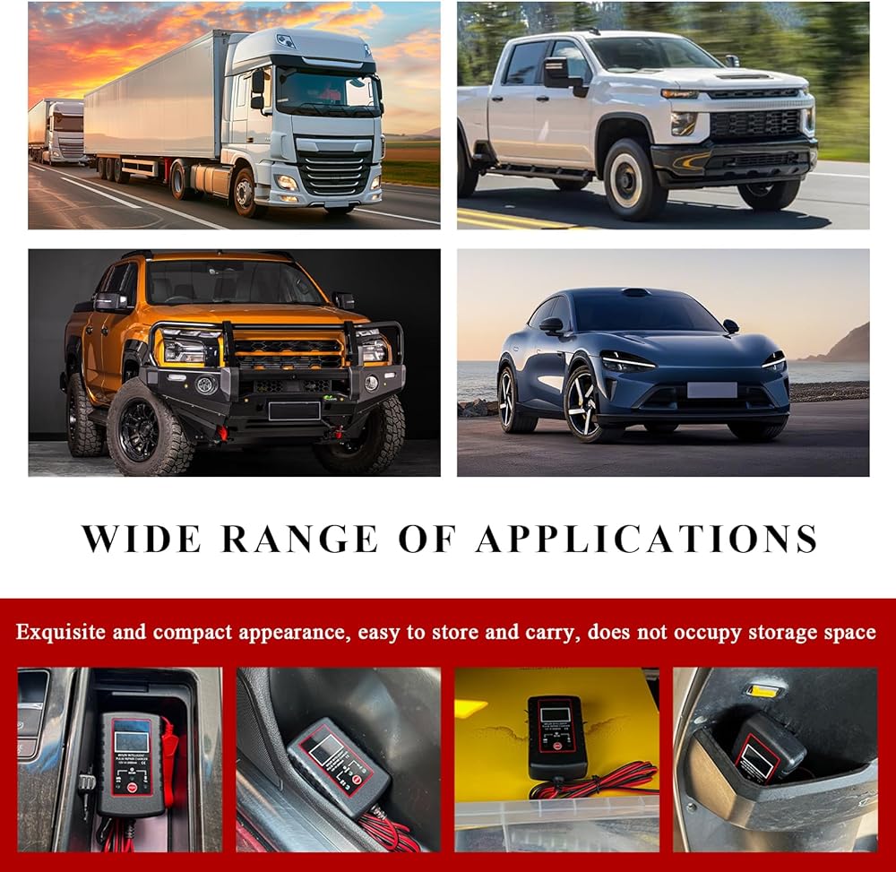 Wide Application: This charger intelligently recognizes most 6V or 12V batteries. It is suitable for cars, motorcycles, SUVs, and trucks, working effectively with lead-acid and deep-cycle batteries. It serves as a practical charging solution for daily vehicle maintenance and battery care