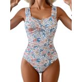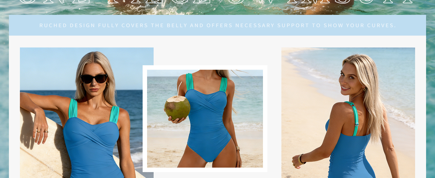 Tummy Control Swimsuits: Ruched design fully covers the belly and offers necessary support to show your curves. The modest bottom could show your good shape and the low back is very cute