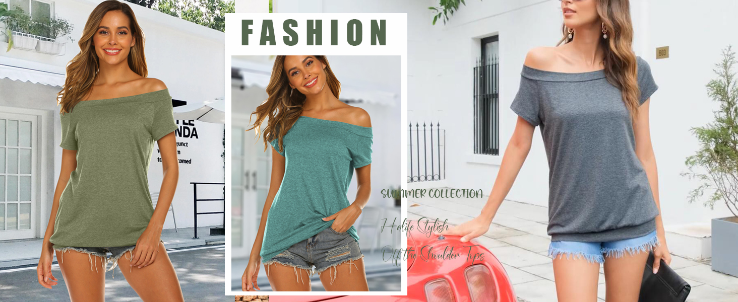 Off the Shoulder T Shirts: Always in style off shoulder tops, classic solid color, loose fitting style, a must have in your summer trendy wardrobe