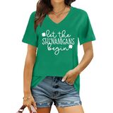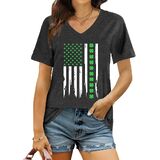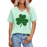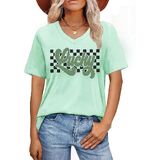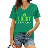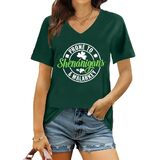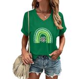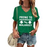 St Patricks Day Shirt: The v neck design shows off a woman's graceful neckline. The lucky t-shirt has a lucky irish shamrock print, along with unique rainbow leopard graphic and the "prone to shenanigans" letter print