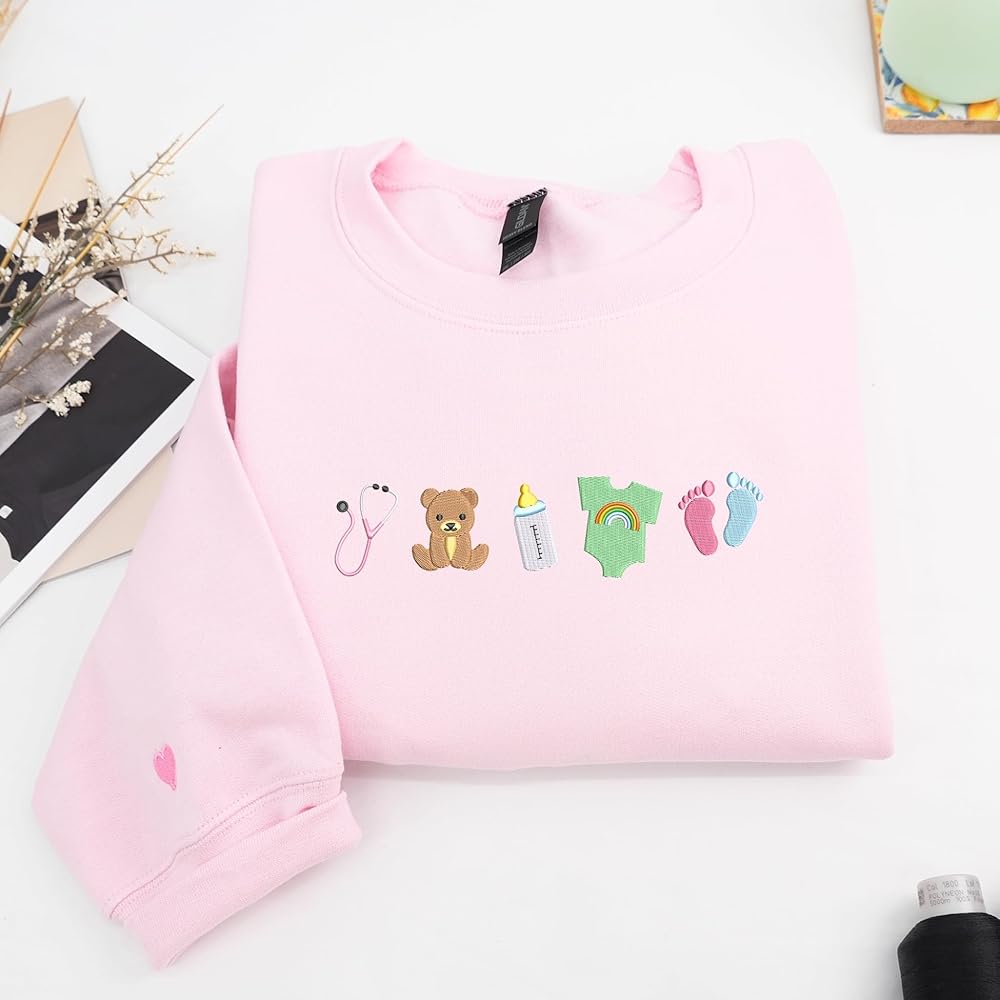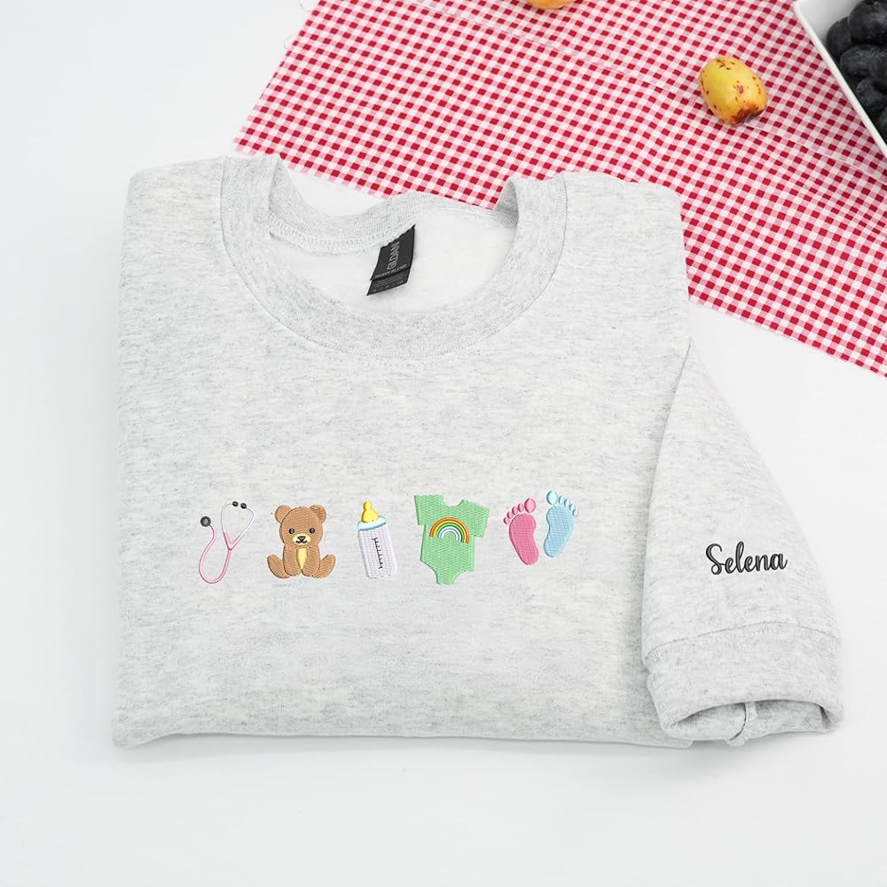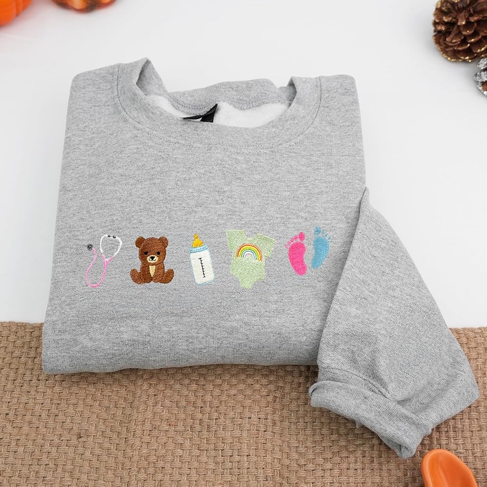 Every day brings new beginnings in the world of infant care, and this embroidered sweatshirt was designed to celebrate the gentle hearts behind those moments. Perfect for NICU nurses, pediatric staff, or maternity caregivers, it blends softness, warmth, and meaning in one heartfelt piece. Crafted from a cozy cotton-blend fleece, this sweatshirt keeps you comfortable through busy shifts or relaxing weekends, while the detailed embroidery adds a touch of joy and pride. The design features a lineup of delicate baby icons — a stethoscope, teddy bear, milk bottle, rainbow onesie, and tiny pink-and-blue footprints. Each symbol represents care, hope, and love — reminders of the dedication that brings comfort to the smallest patients. Each sweatshirt is embroidered to order with precision and care, ensuring that no two are exactly alike. More than apparel, this piece is a tribute to those who nurture new life with patience and heart — a perfect everyday layer that celebrates both profession and purpose.