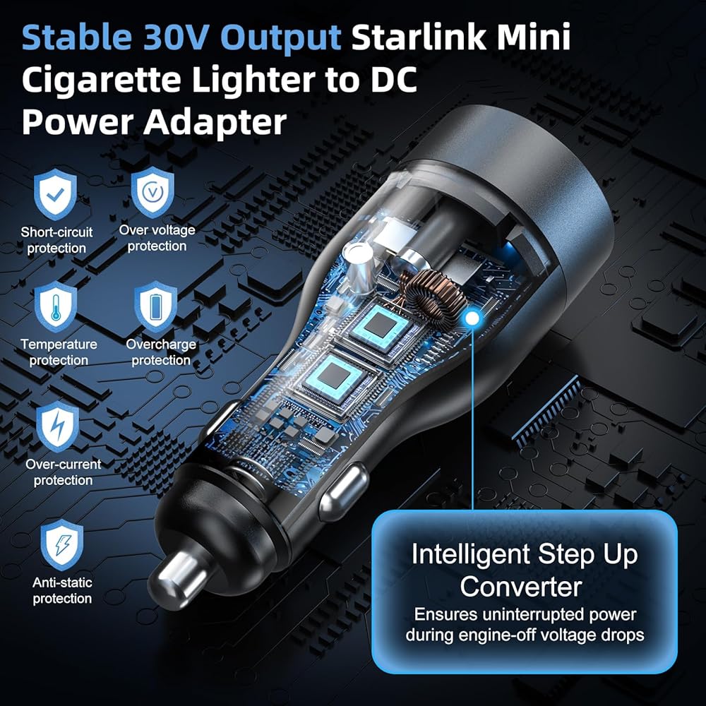 [ Built-in Step Up Converter & Triple-Protection ] Linkoostar Starlink Mini adapter unlike standard cigarette lighter cables that lack a built-in boost converter, Features efficient 12V/24V→30V step-up conversion for all car cigarette lighter plugs. this ensures stable power delivery by preventing restarts due to voltage fluctuations.Engineered for Starlink Mini with intelligent safety safeguards, the cigarette lighter to DC power adapter actively defends against short circuit protection, overheat protection, and overcurrent protection. Delivering uninterrupted power across deserts or alpine trails.