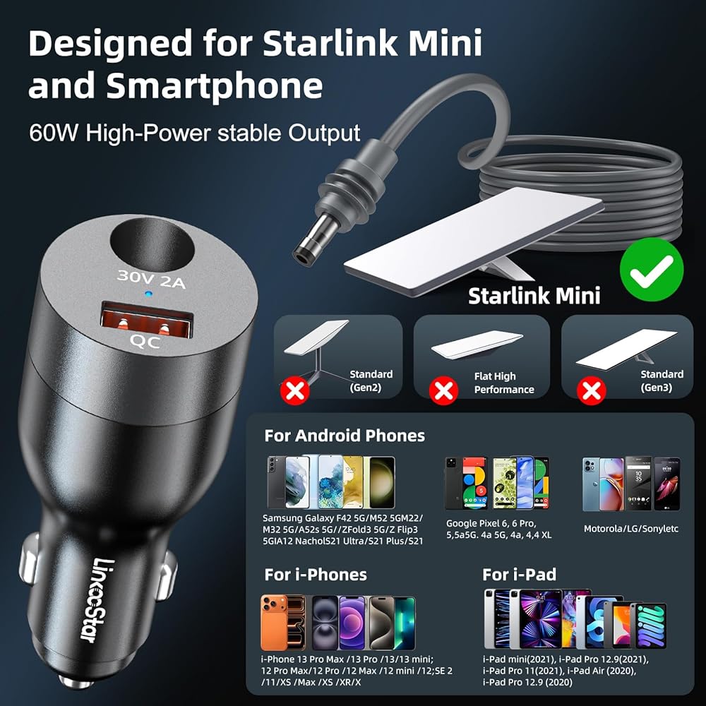 [ Dual-Port Total 78W Power & 2-in-1 Charging ] Equipped with dual intelligent chips, this starlink mini DC car adapter delivers 60W stable power via the DC port and 18W fast charging via the USB-A port. Charge your starlink mini and phone/tablet simultaneously---perfect for road trips, camping, or remote work setups. Universal cigarette lighter plug for cars, trucks, RVs and boats, supporting varied power needs during travel.