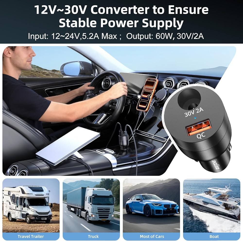[ Stable 12V/24V to 30V Boost for Long Cable Runs ] The starlink mini power car adapter features advanced step-up conversion technology, providing convert any 12V/24V cigarette lighter adapter to stable 30V/2A output. Auto-voltage stabilization, ensuring safe operation of your starlink mini even extreme conditions (-20°C to 60°C). This starlink mini 12V adapter reliably powers official cables up to 50 meters (164ft) with minimal voltage drop, ensuring uninterrupted connectivity. (Note: Ensure your cigarette lighter socket supports at least 144W output (12V/12A) ).