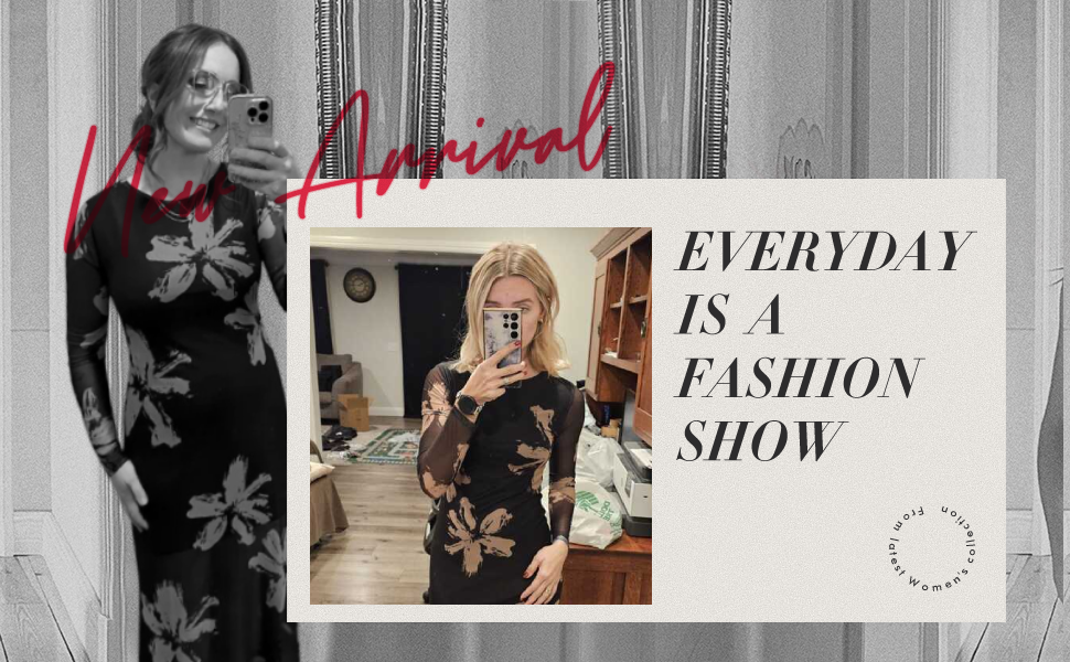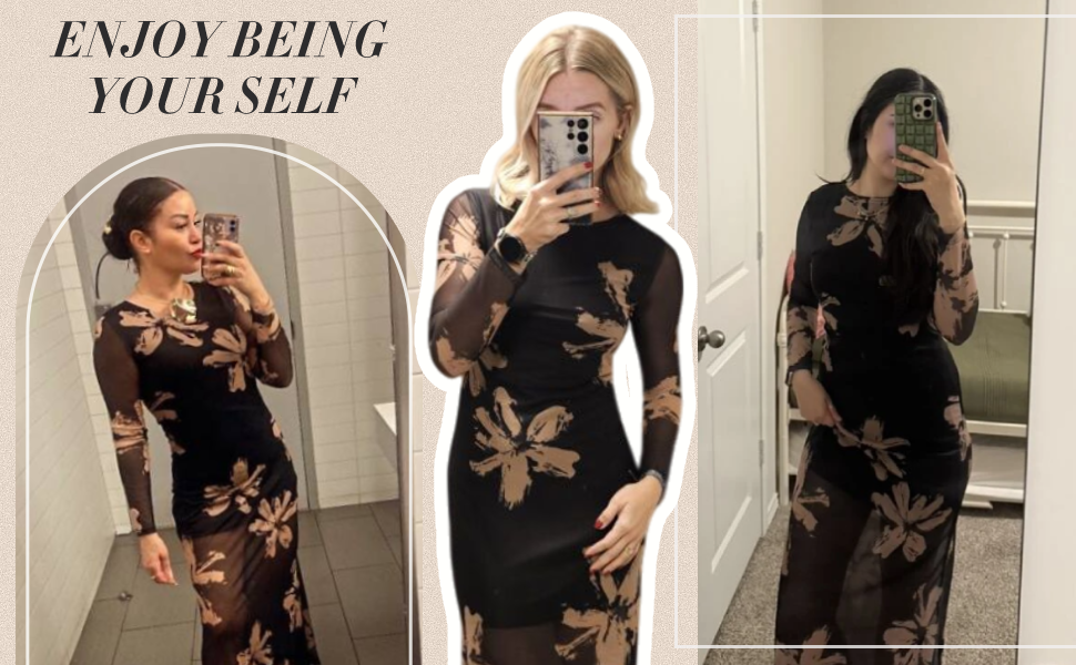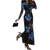 Design: Round neck; long sheer sleeves; maxi length; floral print pattern; see through mesh detail; bodycon fit; medium stretch composition; pull on closure; full lining except for sleeves; elegant chic style for a sophisticated look.