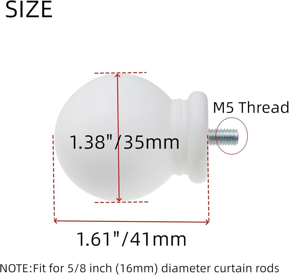 Specification: Curtain rod finials are fit for 5/8 inch (16mm) diameter curtain rods; Thread Size: M5 x 0.8mm; Screw Diameter: 5mm /0.2"; Finial Size: 1.38"x1.61"/35x41mm (DxL); Note: It's a small finial, please check the size before purchase
