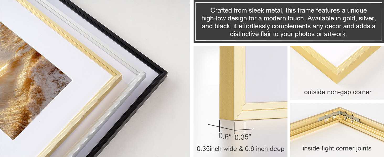 تصميم إطارات من الألومنيوم بحافة مرتفعة ومنخفضة: يضيف هيكل الحافة المرتفعة والمنخفضة لإطار الصورة المصنوع من الألومنيوم عمقًا وملمسًا، مما يخلق شاشة مذهلة بصريًا. مع خطوط نظيفة وتصميم بسيط، فهو يكمل ديكور المنزل المعاصر بشكل مثالي. يتميز هذا الإطار المعدني الراقي المصنوع بدقة، بتصميم سلس وزوايا خالية من الفجوات، مما يضمن مظهرًا أنيقًا ولامعًا يعزز عرض صورك أو أعمالك الفنية