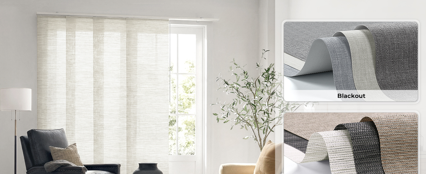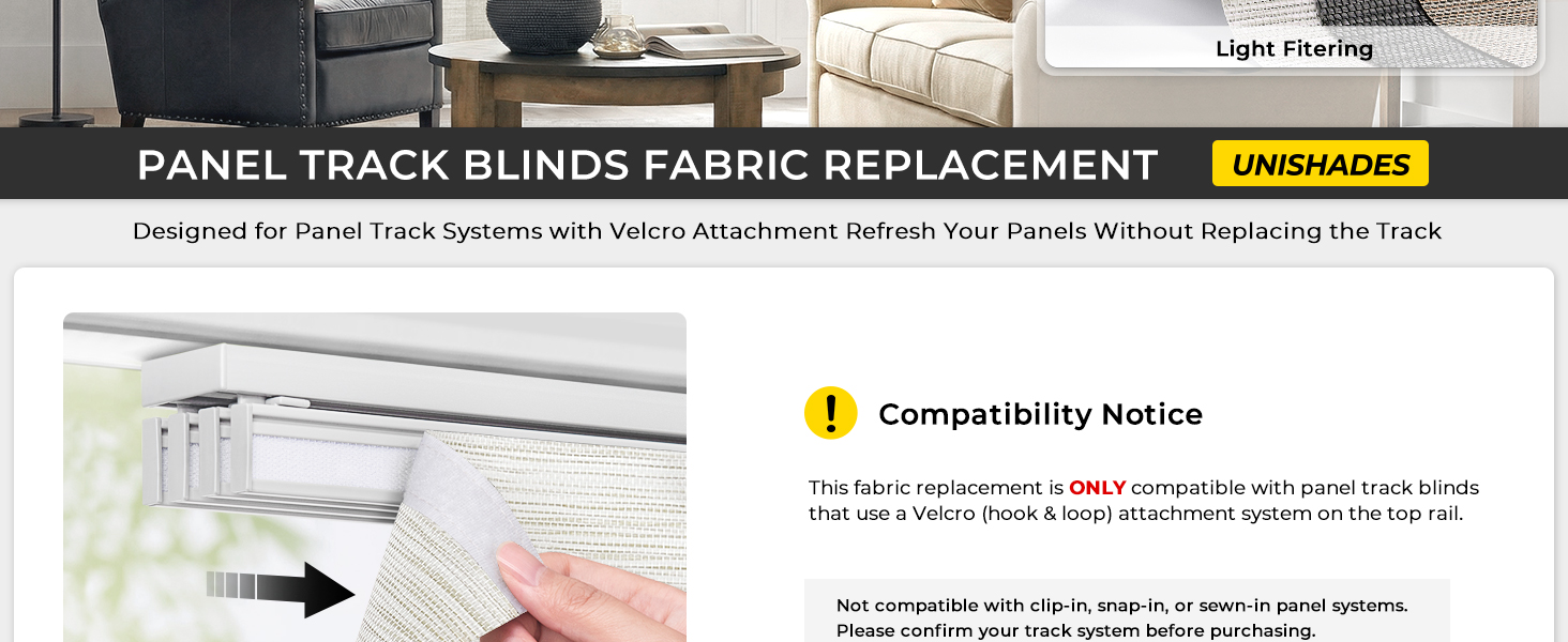 1. Compatible with panel track blinds that use a hook-and-loop attachment system. The fabric panels attach securely to the sliding track for smooth and stable operation. Track and hardware are not included.