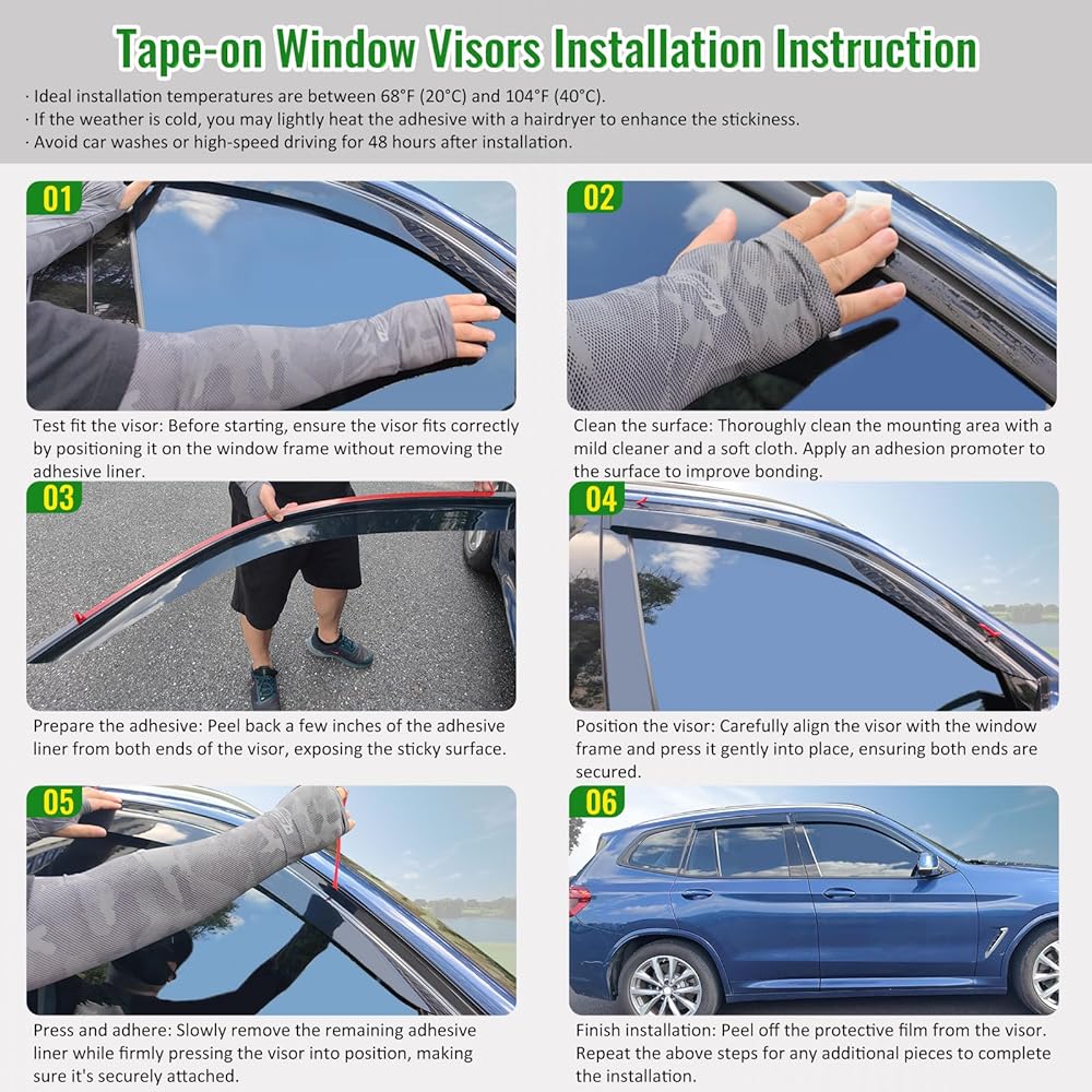 Easy Installation: Instruction is NOT included! Includes 4 Pieces of Window Visors. No drilling or skills required. Simply apply the double-sided tape to each visor and stick it to your car - done in minutes!