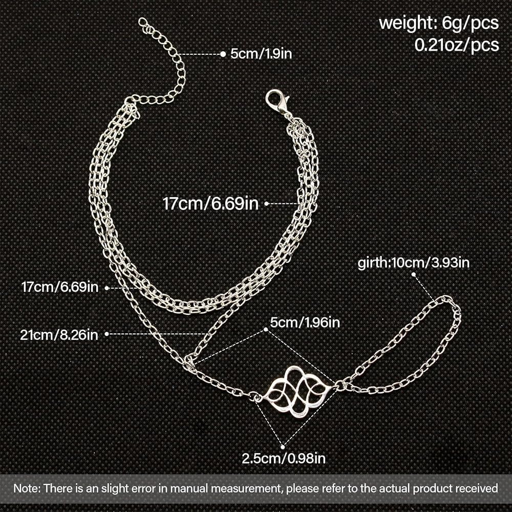 Adjustable Stacking Chain Bracelet: Length: 6.7 +2 in/17+5 cm(Wrist).3.9 in/10 cm(Back of the Hand). Weight: 6g. Lightweight multi-layer bracelet with adjustable chain, perfect fit for different wrist sizes, comfortable to wear